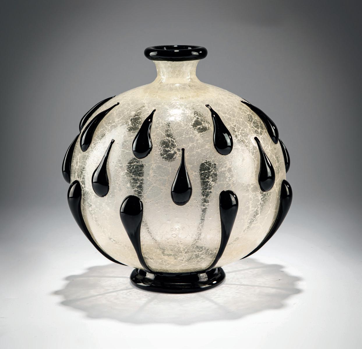 Spherical shape with 24 applied drops; narrow neck with flared rim; on a hollow base. H. 23.5 cm. Execution: Fratelli Barovier. Colorless, slightly milky, bubbly and crackled, so-called 'Primavera' glass; foot, appliqués and rim made of black glass..