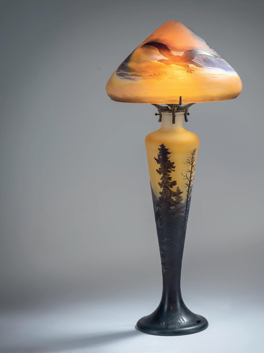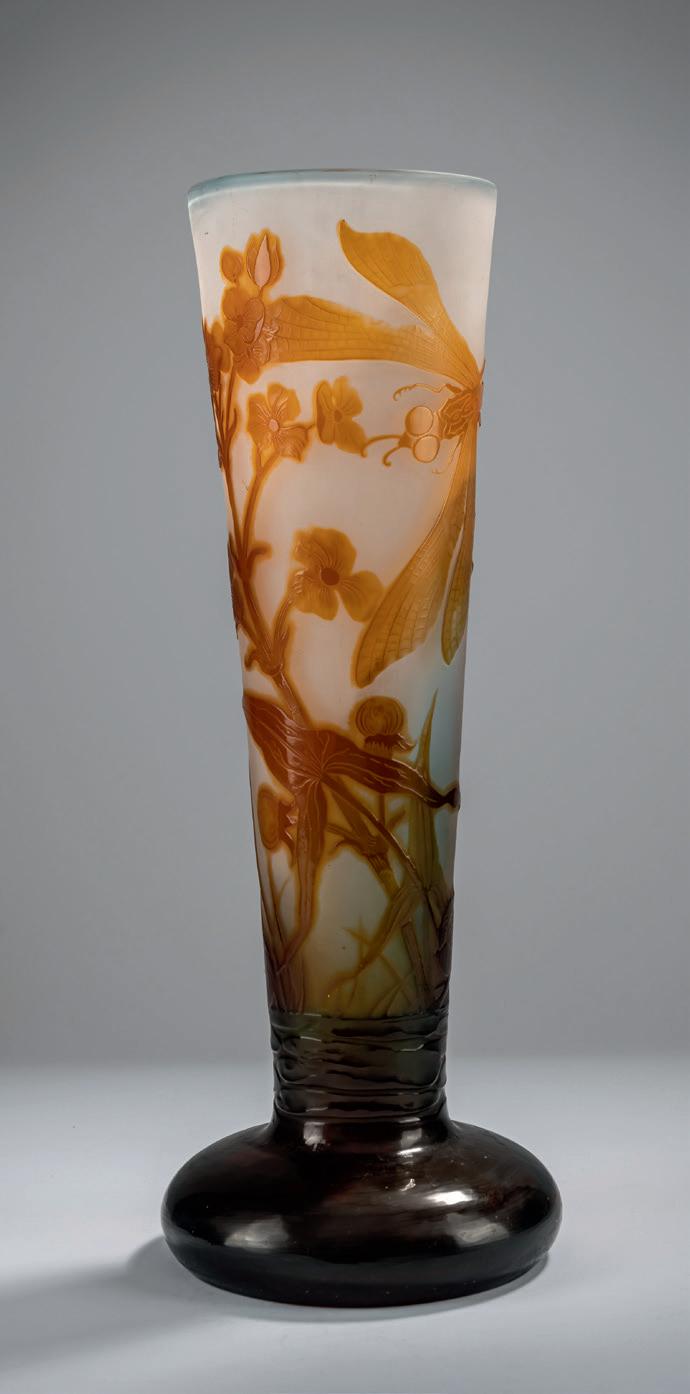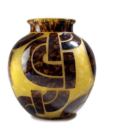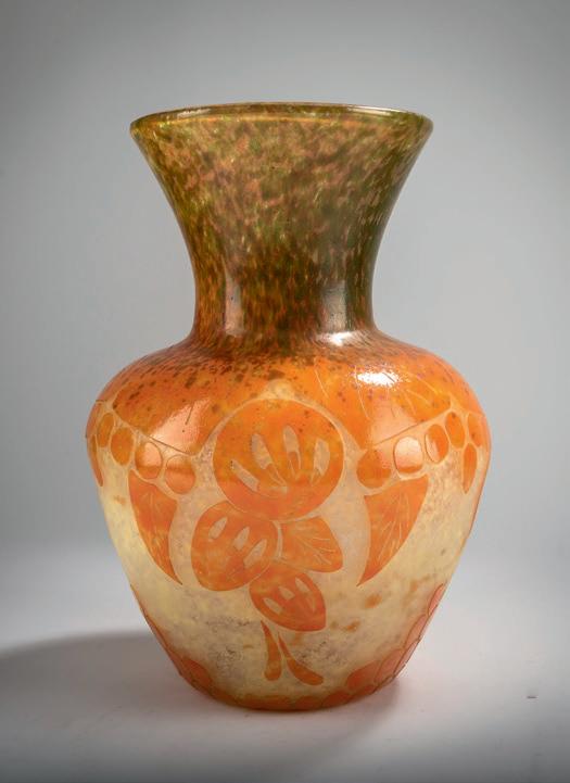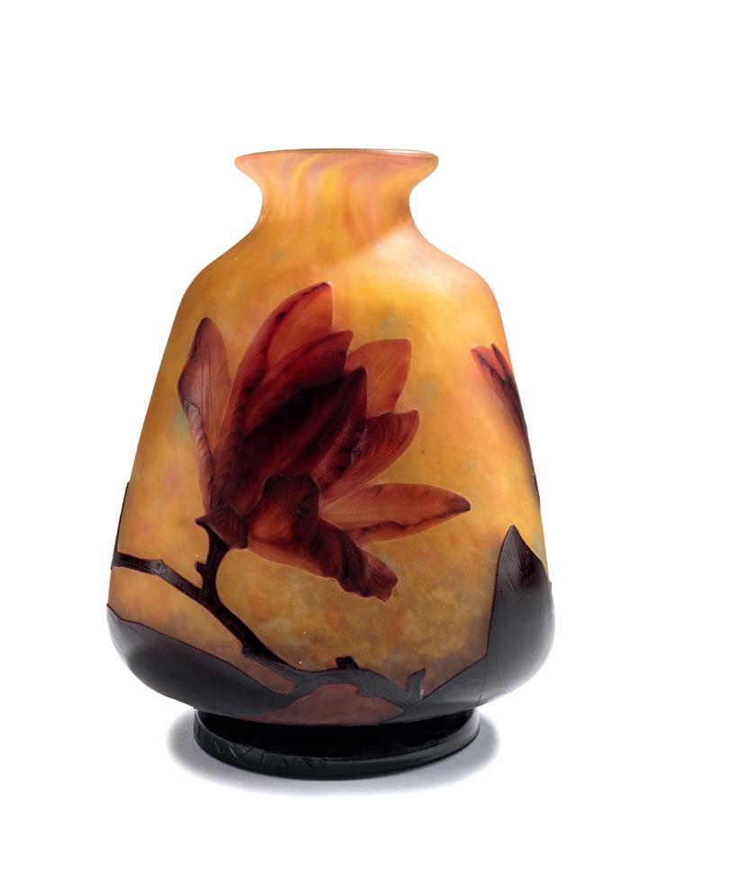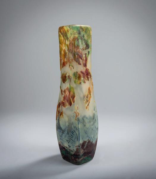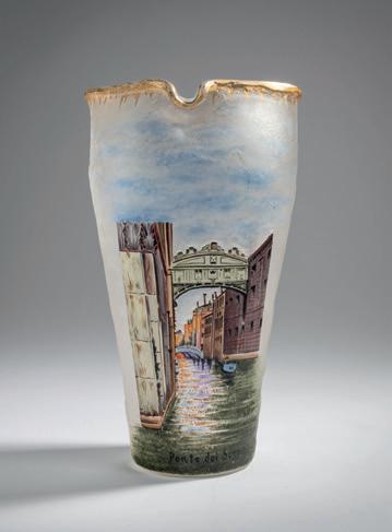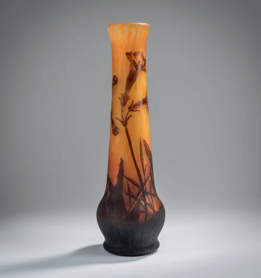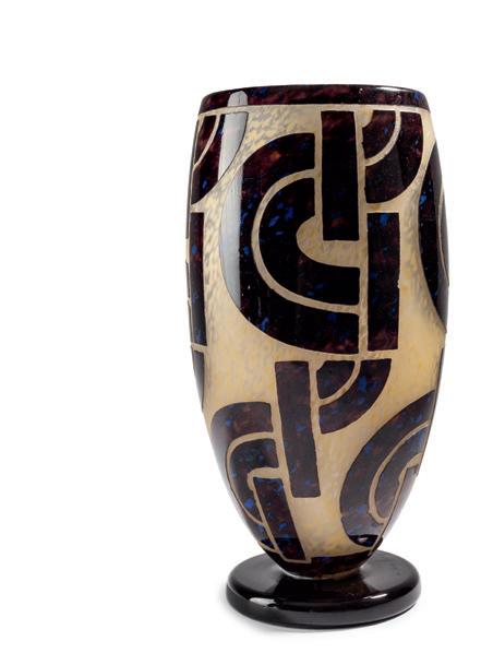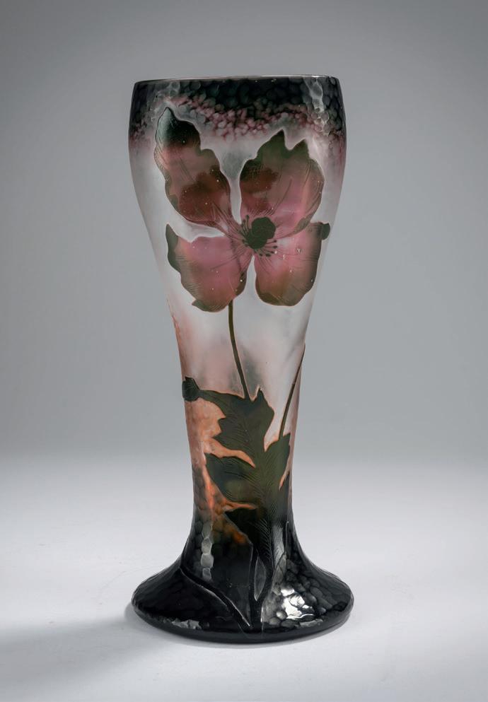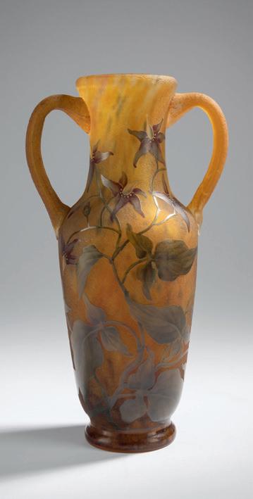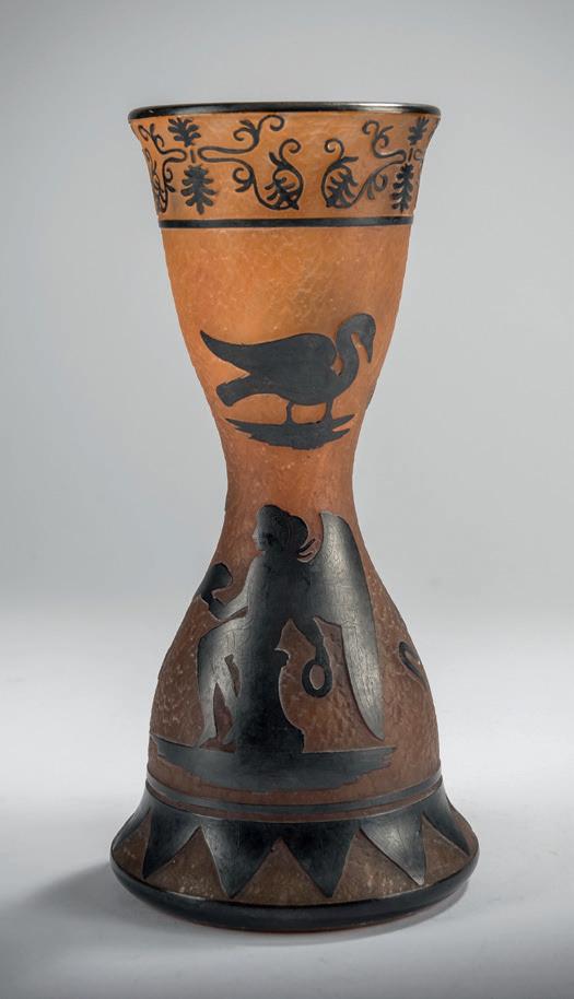 Gegenläufige Doppel-Glockenform. H. 18,4 cm. Überfangglas, farblos, mit orangefar benen Pulvereinschlüssen. Geätzter Dekor mit griechisch/ägyptisch anmutenden Vögeln, Tieren und Menschendarstellungen in Schwarzlot gehöht, auf rauhem Grund. Bänder unter der Mündung bzw. über dem Stand mit stilisierten Ranken. Boden sign.: Daum, Lothringer Kreuz, Nancy (Schwarzlot).