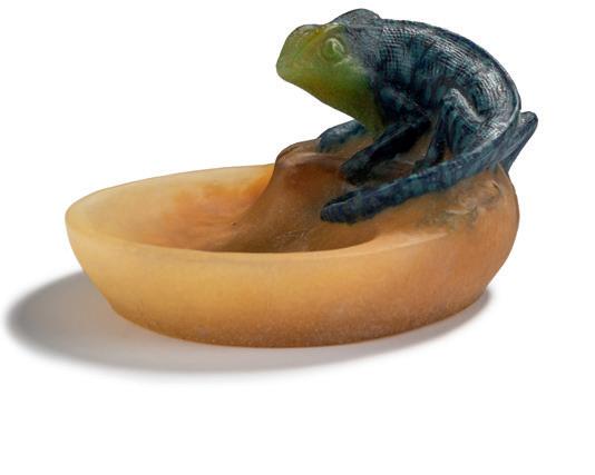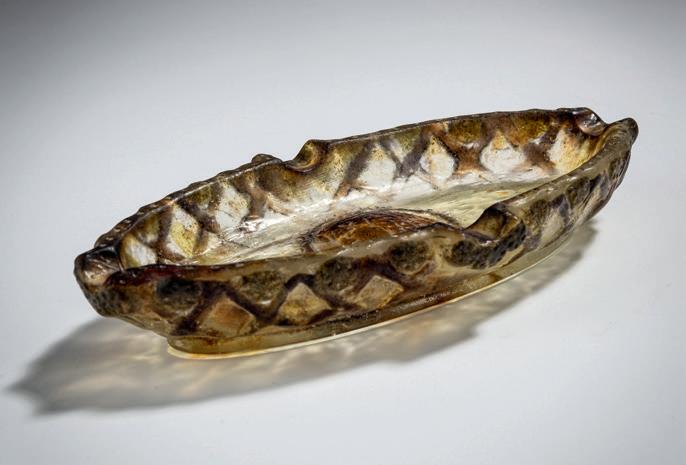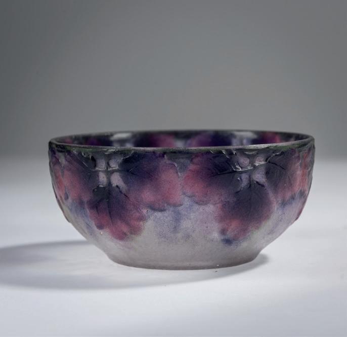 Kleine Schale 'Feuilles larges', 1914 H. 4 cm, Ø 9 cm. Pâte de verre, farblos, violett und grau. Reliefierter Blattdekor. Sign.: G. ARGY-ROUSSEAU (vertieft).