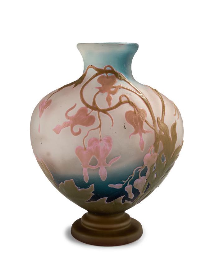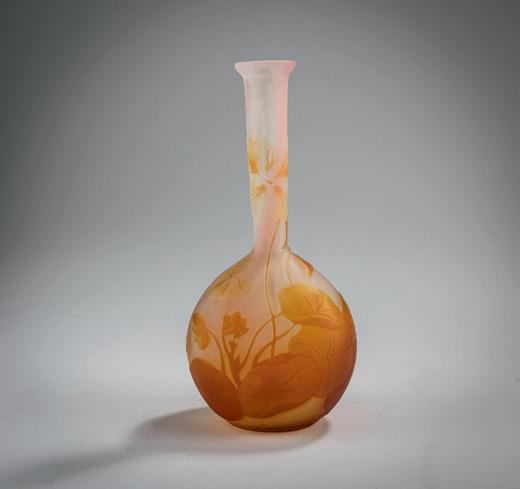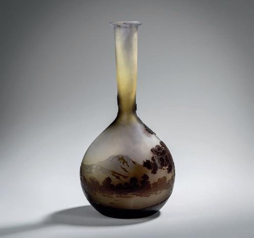 Zweiseitig abgeflacht Rundform auf ovalem Grund. H. 12 cm. Überfangglas, farblos, im unteren Bereich hellgrüne und im oberen Be reich rosafarbene Pulvereinschlüsse, geätzt, polychrom emailliert und mit Schwarzlot bemalt. Umlaufender Dekor: blühender Klee und Doldenblüten auf einer Wiese am Ufer einer weiten Auenlandschaft im zarten Licht der Morgenröte. Boden sign.: Daum Nancy, Lothringer Kreuz (Goldsignatur).