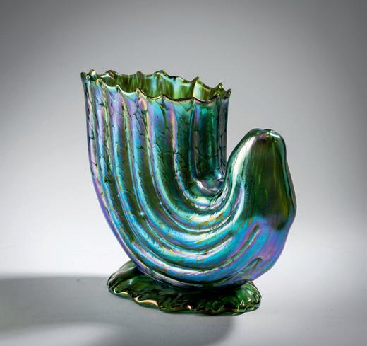 Schlanker Balusterschaft über hochgewölbtem Fuß mit umge schlagenem Rand, blütenförmige, angesetzte Kuppa in Knospen form H. 31,6 cm. Überfangglas, opalweiß, farblos und grün. Grüner Schaft, am Ansatz grüne Kuppa, Fußunterseite und Innenwandung der Kuppa gold- und perlmuttfarben mattlüstriert. Fußunterseite sign.: L.C.T. IL oder b 22B (graviert). € 5.000 - 6.000
