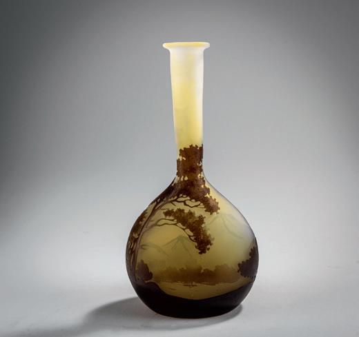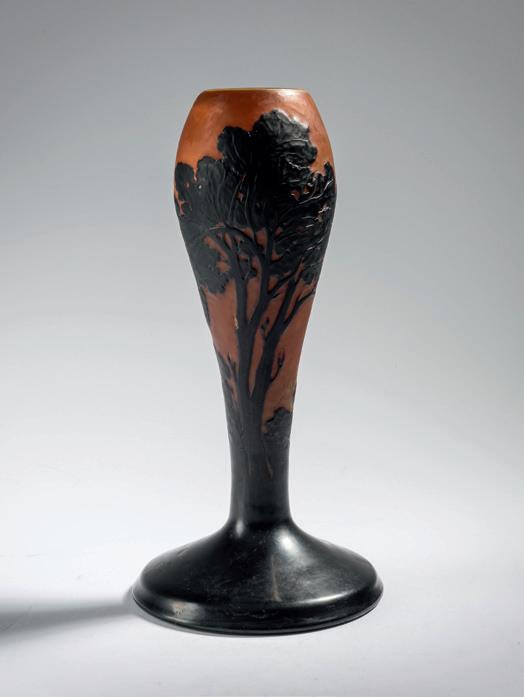 Zylinderform nach oben hin dreipassig. H. 19,9 cm. Ausführung: Daum Frères, Nancy. Überfangglas, milchig weißliche, rosafarbe ne und hellgrüne Pulvereinschlüsse. Geätzter und mit Schwarzlot gehöhter Dekor. Motiv mit kahlen Birken, die sich unter einem Früh jahrsschauer beugen. Boden sign.: Daum Nancy, Lothringer Kreuz, Nancy (graviert). Vgl. Ricke/Schmitt, Glassammlung Gerda Koepff, Kunstmuseum Düsseldorf, München 1998, Nr. 90, dort ausführliche Besprechung der unterschiedlichen Ausführungen und Ausstellungen.