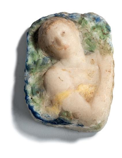 Henri Cros, Sèvres Relief Frauenbüste, um 1893 15,5 cm, 11 x 5 cm. Pâte de verre, transluzide Glasmasse, Pulveraufschmelzungen vorwiegend opalweiß, grün, blau und gelb. Nicht sign. Restaurierte Bruchlinie. Vgl. Daum, La pâte de Verre, Lausanne 1984, Nr. 19. € 1.200 - 1.400