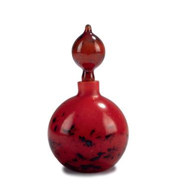 Zweiseitig abgeflachte Kugelform auf Rundfuß. H. 15,4 cm. Über fangglas, milchig opaleszierend und farblos, gelbliche, rostbrau ne, weinrote und grüne Emailaufschmelzungen (Vitrifications).