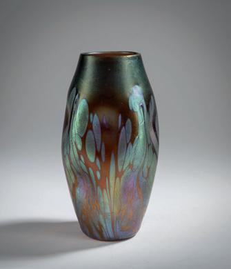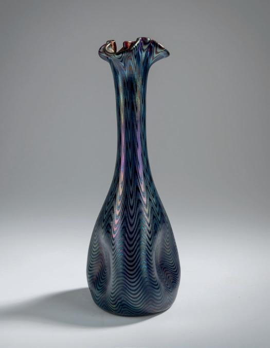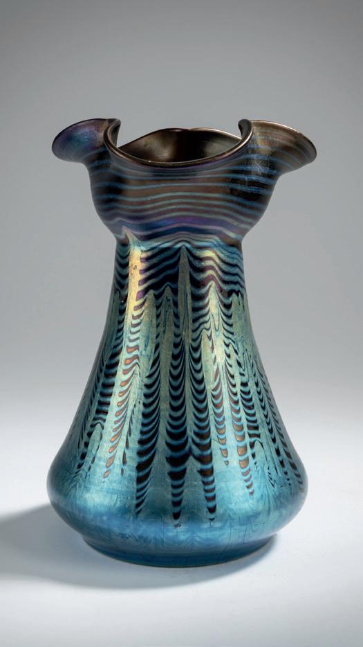 Dreifach eingedrückte Tropfenform mit langem, geraden Hals und mehrpassiger Mündung. H. 24,5 cm. Prod.-Nr. 674. Über fangglas, rubinrot und farblos, im Rippenmodel wellenförmig verzogener Phänomendekor aus silbergelben Fäden, Gre 6893, petrol- und perlmuttfarben mattlüstriert. Ricke/Ploil, Lötz Böhmisches Glas, Bd. II, München 1989, S. 108. Vgl. Höltl (Hrsg.), Das Böhmische Glas, Bd. IV, Passau 1995, S. 69, Nr. IV.101; vgl. Ricke/Ploil, Lötz Böhmisches Glas, Bd. 2, Mün chen 1989, S. 108, Schnitt-Nr. 674. € 600 - 800