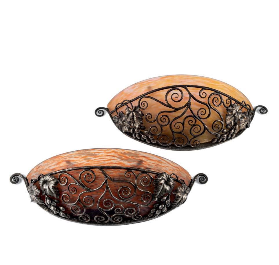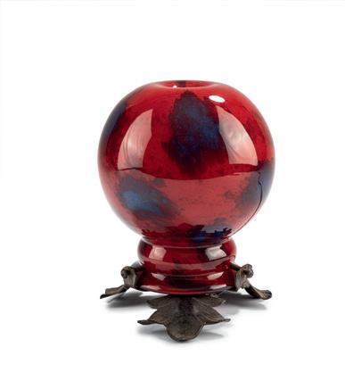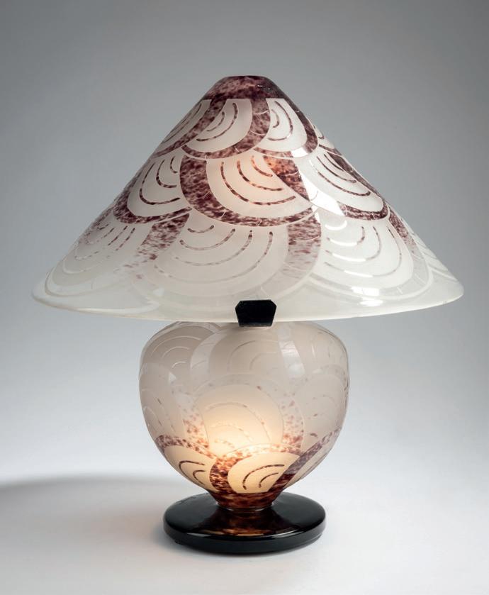 Kugelförmiger Schirm mit reliefierten, stilisierten Blättern. Gerader, vier-ästeliger Schaft auf flach gewölbtem Rundfuß. H. 36,5 cm, Ø 16,5 cm. Pâte de verre, transluzide Glasmasse, farblos, reliefierte Blätter in Siegelrot und Dunkelbraun. Sign.: G. ARGY-ROUSSEAU, FRANCE (vertieft). Fuß aus geschwärztem Schmiedeeisen. Bloch-Dermant, G. Argy-Rousseau, Paris 1990, S. 121, S. 210, Nr. 26.15.