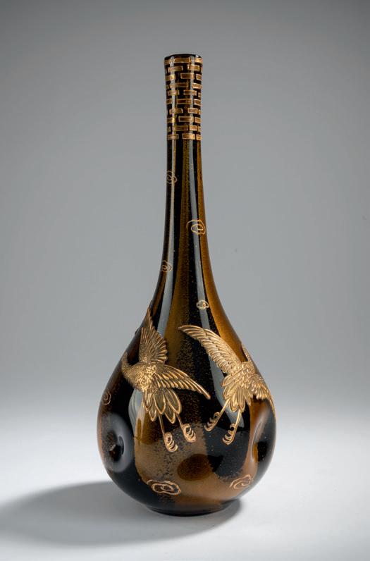 Mit sechs Eindellungen. H. 33,8 cm. Überfangglas, dunkelrot und bernsteinfarben, 'Ophir'-Dekor aus Metallfolieneinschlüs sen. Reliefierter Golddekor, Motive mit Kranichen und Wolken.