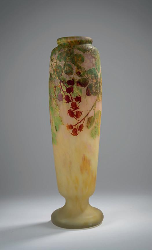 Leicht trichterförmig geschweifter Becher. H. 17,1 cm. Pâte de verre, transluzide Glas masse, leicht grünlich, grau gestreift. Dekor aus volutenartig rankenden Zweigen mit dunkelroten Beeren. Sign.: G. ARGY-ROUS SEAU (geprägt). Am Boden eingeprägte Nummer 3561.