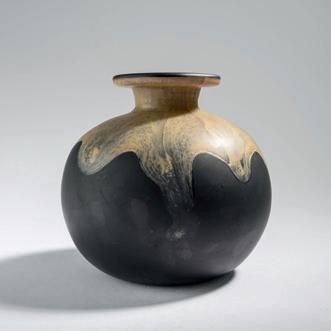 H. 9,6 cm. Überfangglas, farblos und bern steinfarben, vierfach blattartig gekämmter 'Medici'-Dekor aus silbergelben Tupfen, vor bronzefarbenem Grund, stark perlmuttfar ben mattlüstriert.