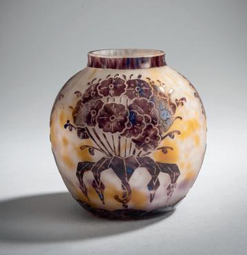Kugelform über verjüngtem Stand. H. 9,2 cm, Ø 11,5 cm. Pâte de verre, transluzide Glasmasse, farblos und violett; reliefierter Fries mit Kürbisblättern, rot, vanillegelb und anthrazitgrau. Sign.: G. ARGY-ROUSSEAU (geprägt). Am Boden: FRANCE (geprägt).