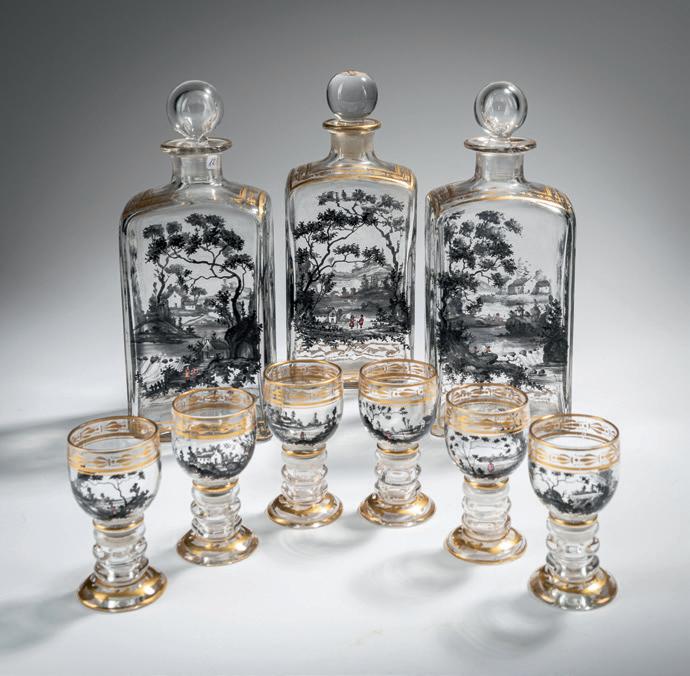 Neun Teile. Drei Liqueurflacons, H. 20,5 cm; sechs Fußbecher, H. 7,2 cm. Farbloses Glas, Landschaftsdarstellungen mit Staffagefigu ren in Schwarzlot, rotem Email und Gold höhung. Flacons sign.: Damon bzw. Damon & Delisle 20 Bd. Malsherbe Paris (gold).