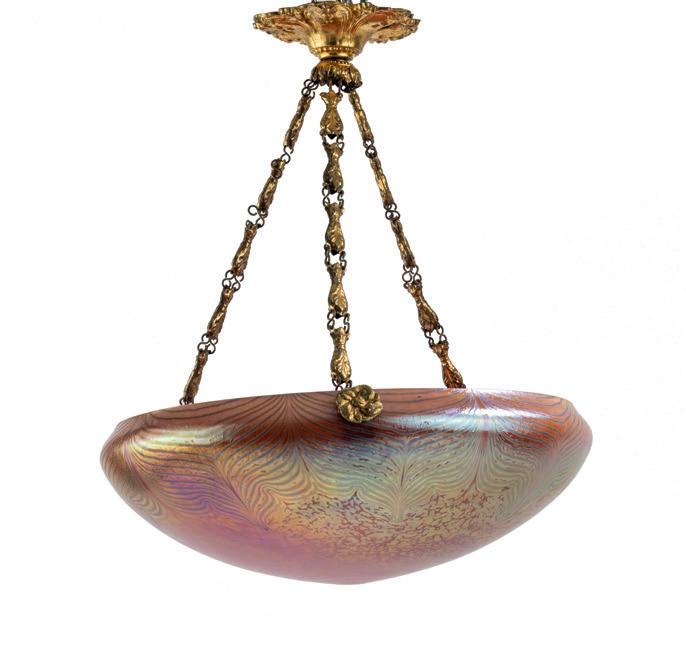 Weite, flache Schale. H. 35 cm, Ø 35 cm. Überfangglas, farblos und rosa, verzogene silbergelbe Fäden und Tupfen, gold- und perlmuttfarben mattlüstriert, ähnlich Gre 566/294. Vergoldete Messingaufhängung. € 2.500 - 3.000