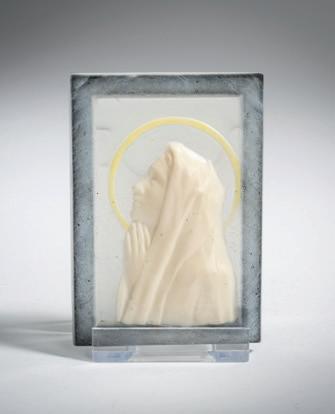9,5 x 6,6 cm. Pâte de verre, transluzide Glasmasse, reliefierte Büste der Mutter gottes elfenbeinweiß und gelb. Sign.: Argy (geprägt).