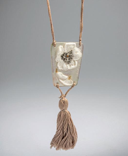 5,6 x 4,3 cm. Pâte de verre, transluzide Glasmasse, farblos, opakweiß, grau und braun. Sign.: G.A.R. Tassel und Kette aus brauner Baumwolle.