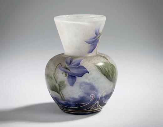 Stark bauchiger Korpus mit trichterförmigem Hals. H. 8,2 cm. Überfangglas, farblos und hellblau, im oberen Bereich hellbern steinfarben. Geätzter und polychrom emaillierter Dekor, Motiv mit Schneeglöckchen, goldgehöht, im oberen Bereich bez.: Pâques (Ostern), vergoldeter Lippenrand. Sign.: Daum Nancy, Lothringer Kreuz (Nadelätzung).