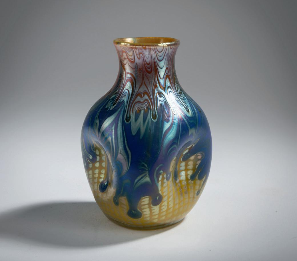 Über rundem Stand bauchiger, dreifach eingedellter Korpus mit schlankem Hals und ausschwingender Mündung. H. 13 cm. Ausfüh rung: Lötz Wwe., Klostermühle. Überfangglas, opalgelb und farblos, senkrechter Dekor aus senkrecht gestricheltem silbergelben Fadende kor, im oberen Wandungsbereich blauer und silbergelber Fadendekor, wellenförmig verzogen mit tropfenartigen Spitzen, metallgelb Phäno men Gre 353, stark perlmuttfarben mattlüstriert. Im ausgeschliffenen Abriss sign.: Loetz Austria (graviert).