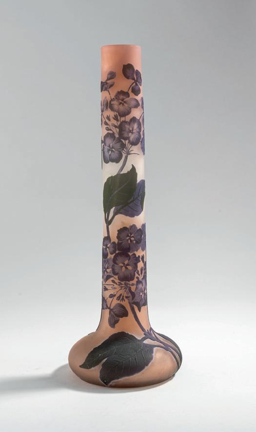Gerader Korpus über Ballenfuß mit leicht ausgestellter Mündung. H. 36,5 cm. Überfangglas, farblos, hellblau, gelb und dunkelblau. Grüne, gelbe und braune Emailaufschmelzungen (Vitrifications). Impressionistisch geätzter Dekor mit Birken in Herbstlandschaft. Boden sign.: Daum Nancy, Lothringer Kreuz (graviert).