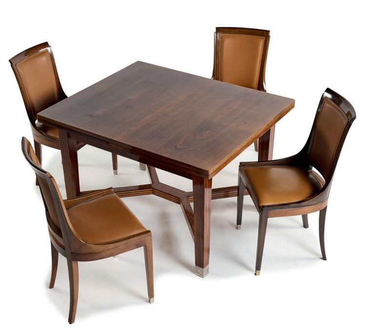H. 72 cm, 58 x 58 cm. Nussbaum, geschnitzt, Ahorn- und Vogelaugenahorn-Furnier.