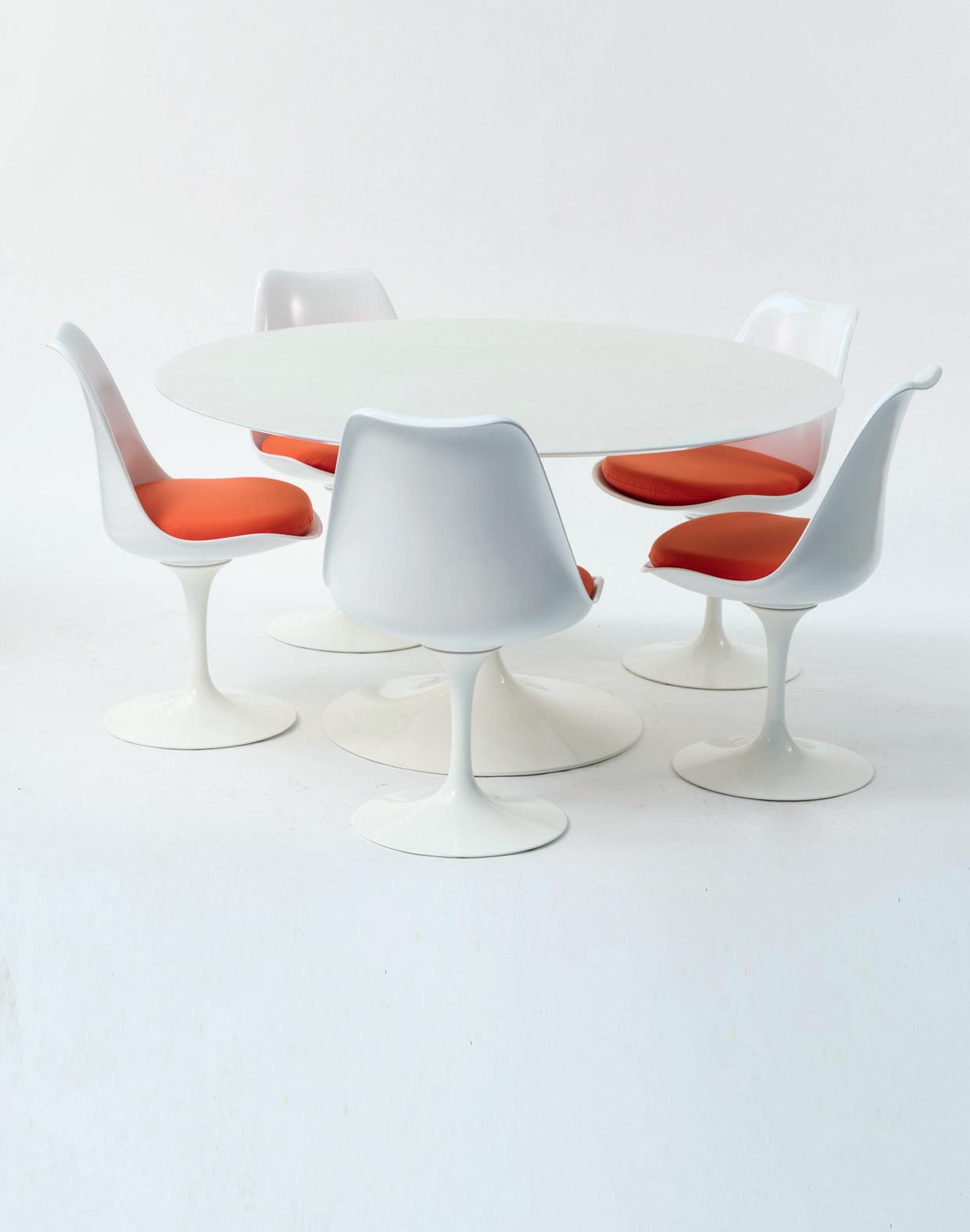 Tisch: H. 67 cm, Ø 80 cm; Sessel: H. 82 x 55 x 73 cm.