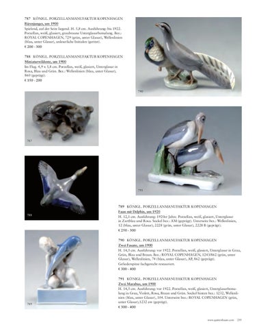 789 KÖNIGL. PORZELLANMANUFAKTUR KOPENHAGEN Faun mit Delphin, um 1920 H. 12,1 cm. Ausführung: 1920er Jahre. Porzellan, weiß, glasiert, Unterglasur in Zartblau und Rosa. Sockel bez.: AM (geprägt). Unterseite bez.: Wellenlinien, 12 (blau, unter Glasur), 2228 (grün, unter Glasur), 2228 B (geprägt). € 250 - 300 790 KÖNIGL. PORZELLANMANUFAKTUR KOPENHAGEN Zwei Fasane, um 1900 H. 14,5 cm. Ausführung: vor 1922. Porzellan, weiß, glasiert, Unterglasur in Grau, Grün, Blau und Braun. Bez.: ROYAL COPENHAGEN, 1243/862 (grün, unter Glasur), Wellenlinien, 74 (blau, unter Glasur), AP, 862 (geprägt). Gefiederspitze fachgerecht restauriert. € 300 - 400