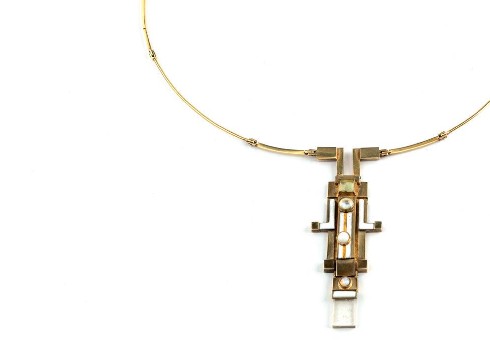 Gelbgold 585, weißes Email, Opal, Mondstein, Bergkristall. 26,40 Gramm.