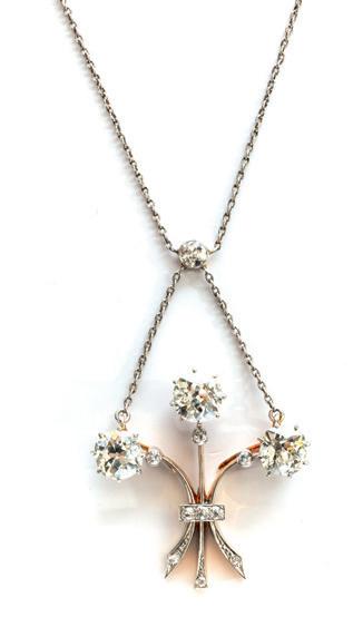 Gelbgold 750, Platin 950, 3 Diamanten im Altschliff.