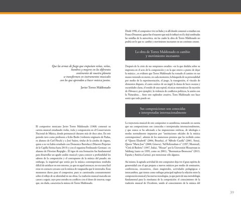 El compositor mexicano Javier Torres Maldonado (1968) comenzó su carrera musical estudiando violín, viola y composición en el Conservatorio Nacional de Música, donde permaneció durante más de doce años. En este periodo tuvo como profesores a Icilio Bredo (violinista originario de Padua, ex alumno de Carl Flesch) y a José Suárez, titular de la cátedra de órgano, quien a su vez había estudiado con Domenico Bartolucci (Maestro Perpetuo de la Capilla Sixtina hasta 2013) y con el organista Ferdinando Germani –ex alumno de Ottorino Respighi–. El rigor de esta formación fue fundamental para desarrollar un agudo análsis musical y para conocer a profundidad los saberes de la composición y el contrapunto de la música del pasado; sin embargo, la inquietud que sentía por la música contemporánea resultaba difícil de satisfacer en este entorno, ya que en aquel entonces, no era tarea fácil estar en contacto cercano con la música de vanguardia que le interesaba. Eran momentos duros para el compositor, pues se cuestionaba constantemente sobre el reflejo de su identidad en sus obras. La tradición musical marcaba un canon a seguir, cuyo peso entraba en conflicto con el deseo de innovar, rasgo que, sin duda, caracteriza la música de Torres Maldonado.