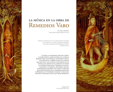 La música, esa misteriosa forma del tiempo, es razón poética y razón pictórica en la obra de Remedios Varo. Alan Heiblum, de rizomática mente, nos adentra en la arbórea mente de la pintora para escuchar y ver la música en movimiento de las estrellas, esa armonía sutil y profunda de donde el universo entero emana. Tejedoras, flautistas, vagabundos, guitarristas, trovadores, amantes, guardabosques, relojeros, aves, sirenas y seres que solo pueden provenir de la admirable imaginación de Remedios, son “interiores en marcha” en busca del principio unificador, en busca del orden primigenio.