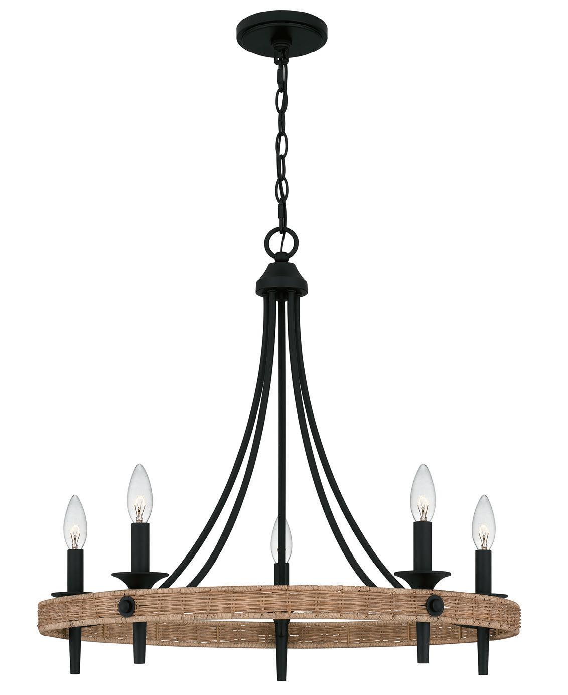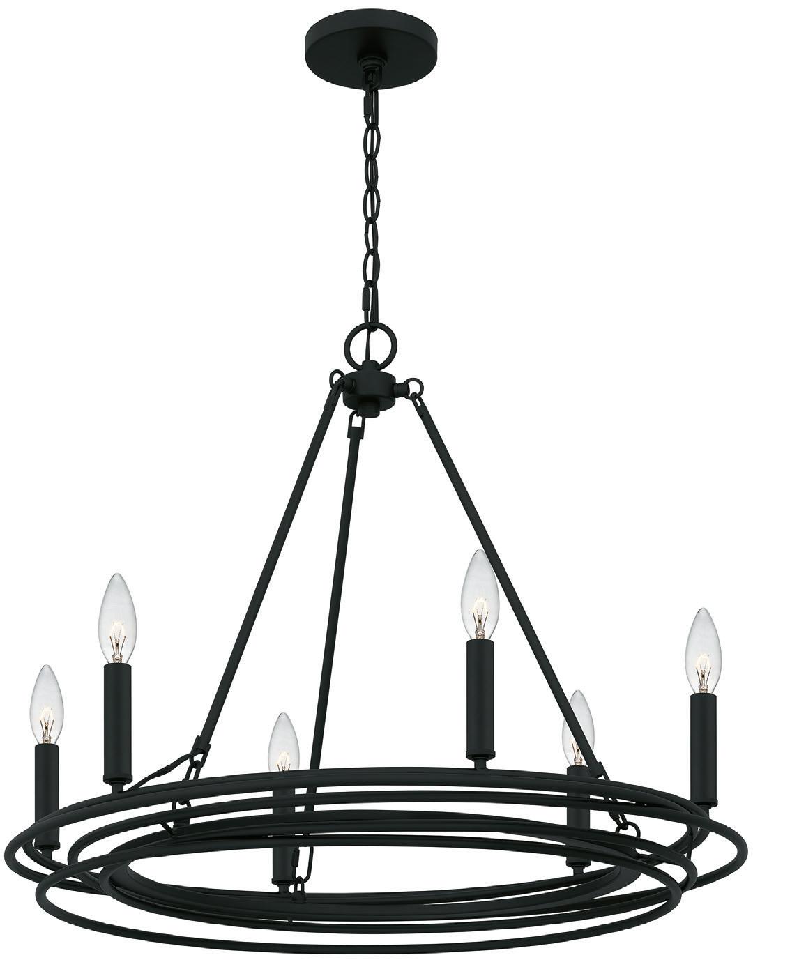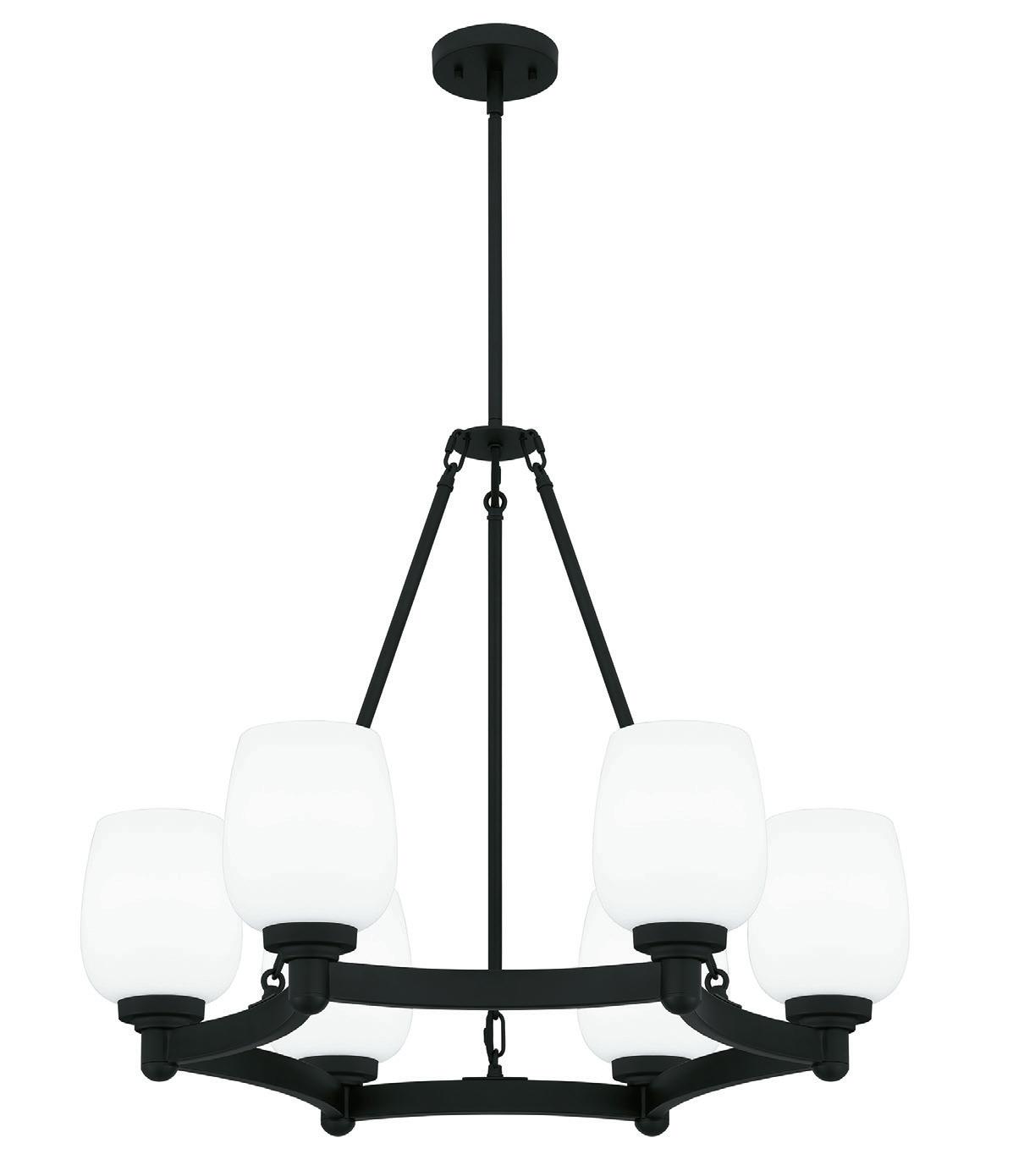 Calliope makes a bold industrial statement with its sculptural, geometric design. Matte black rings of different sizes encircle the round silhouette for a unique spiraling effect. Choose from a flush mount light with opal etched glass or a candle-style chandelier, allowing you to customize to your setting.