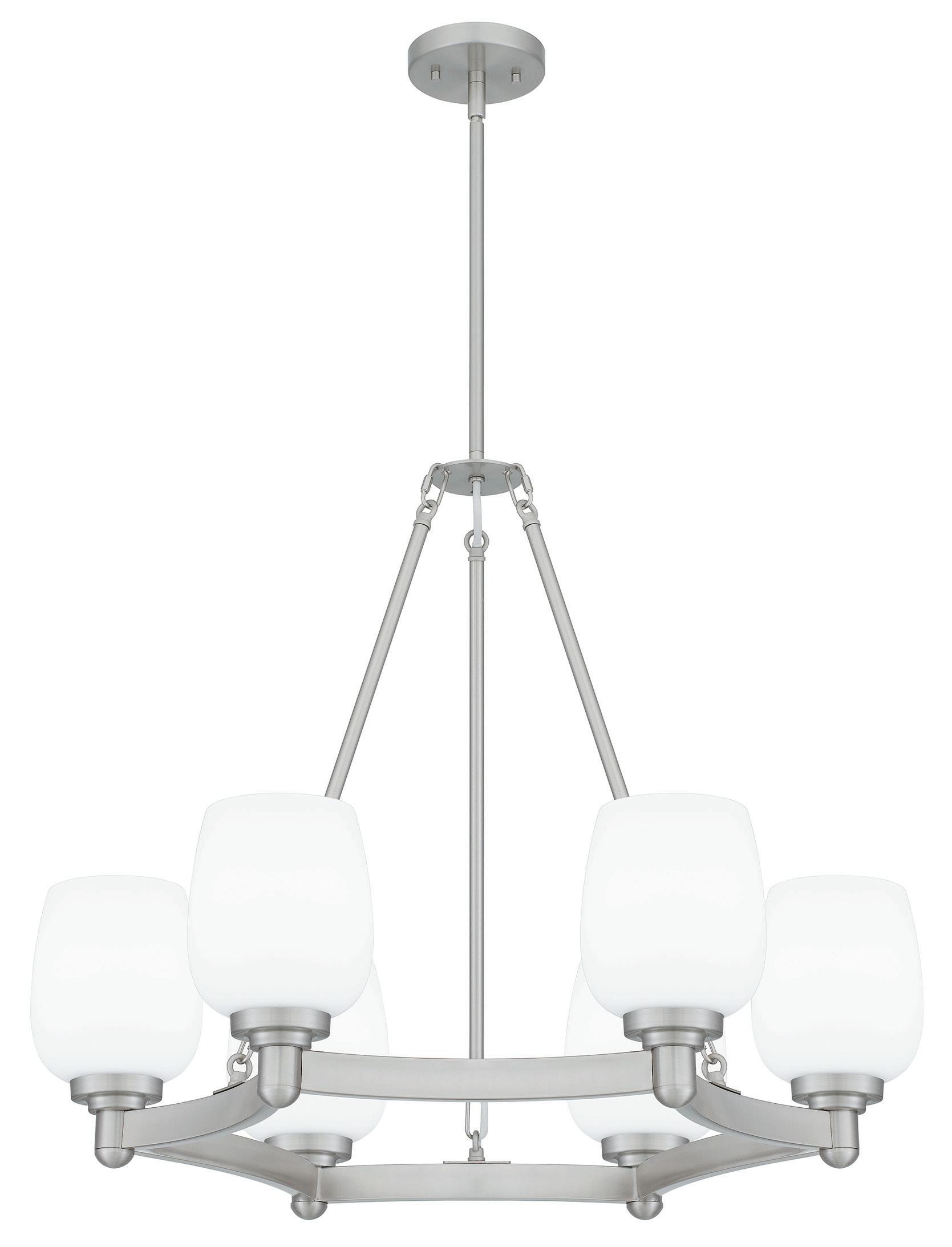 A clean design enhanced by an imperial bronze finish; Mirren is more transitional with a less formal styling. The sweeping arms create a slim silhouette, and the candelabra bulbs emit a soft light for a warm romantic glow. Available in multiple size options, the Mirren chandelier is a great fit for many home design styles and makes for a perfect statement piece over a dining room or kitchen table.