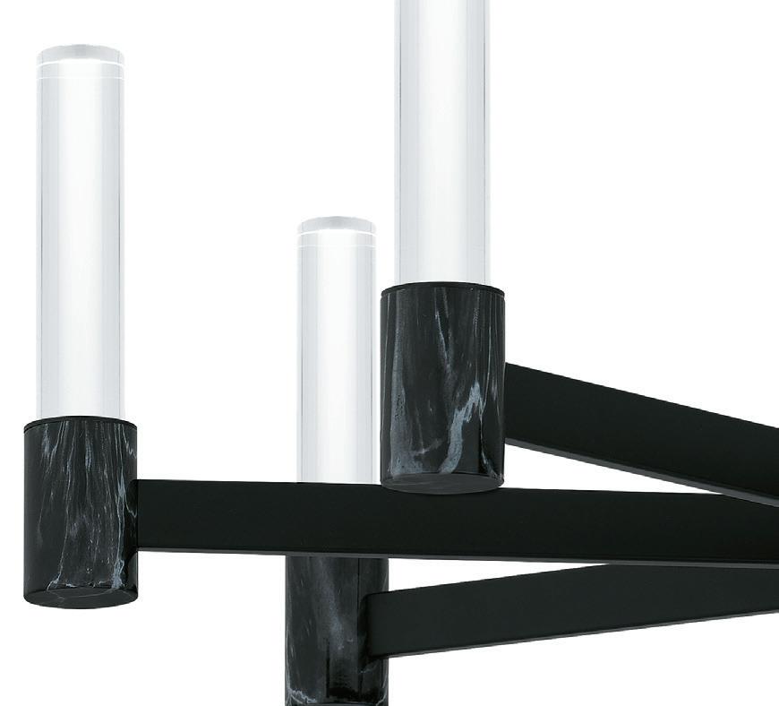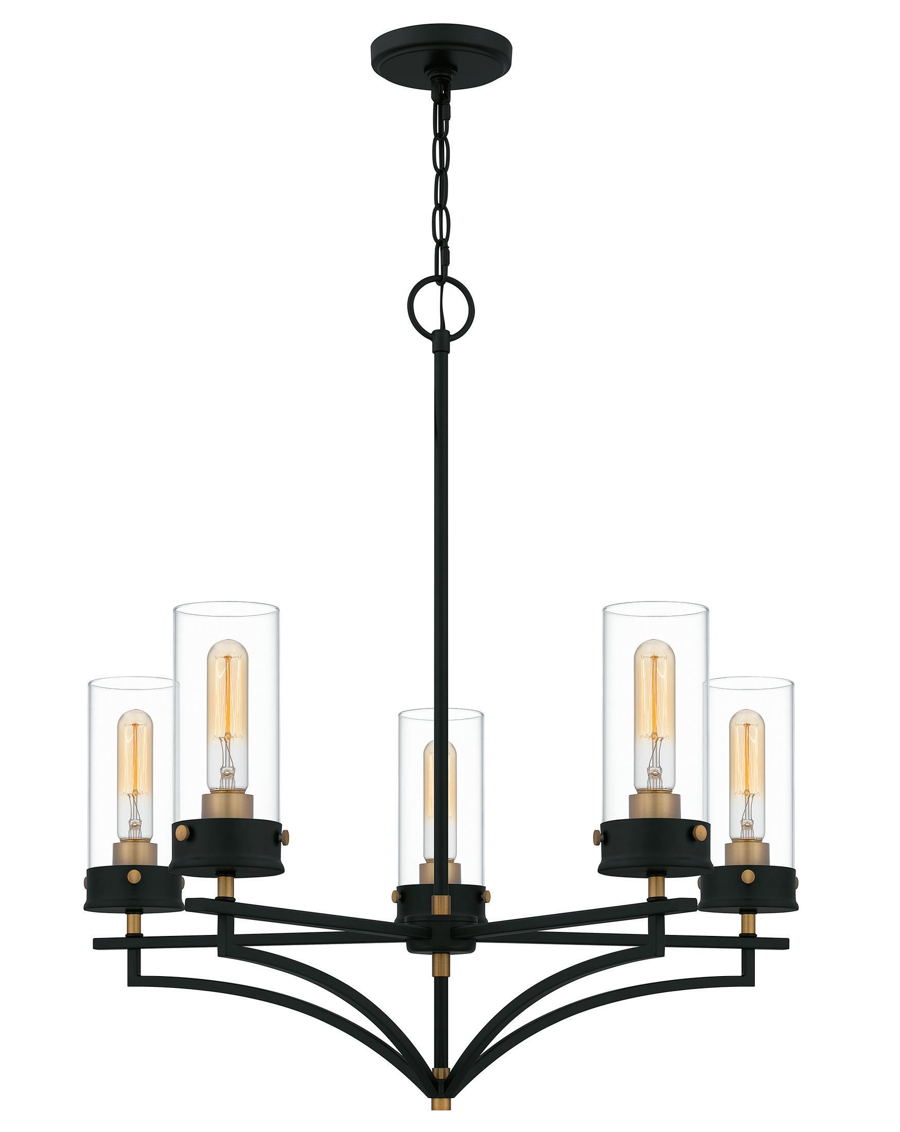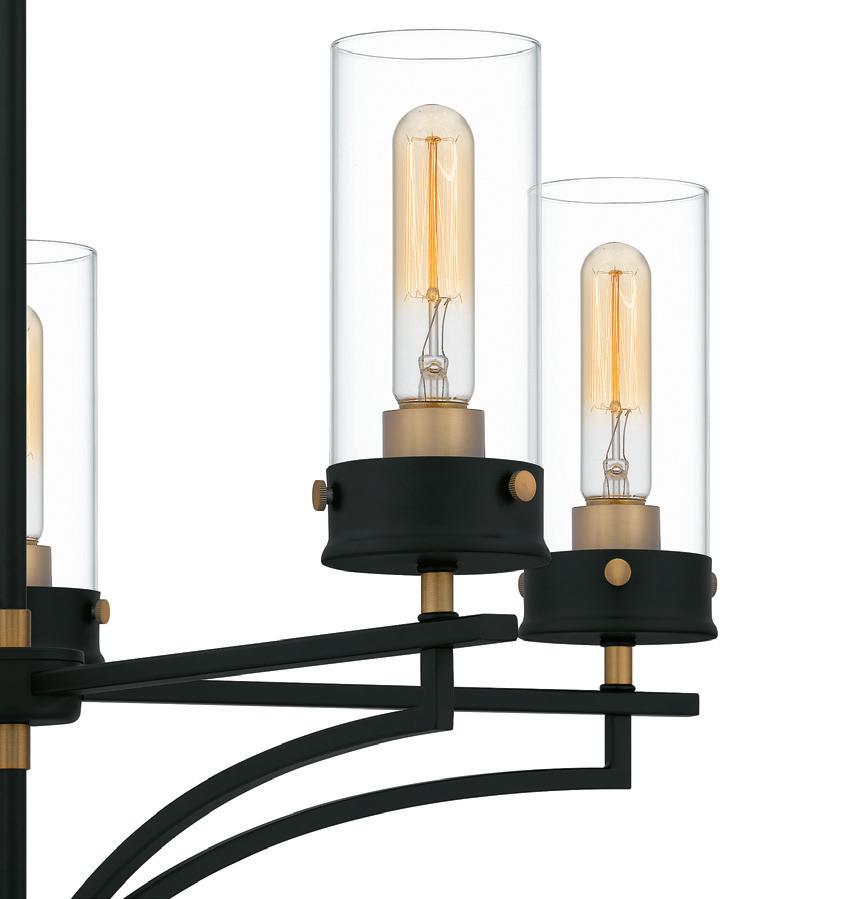 Hillside spotlights modern industrial style. Thin matte black arms are accentuated by clear glass shades and warm brass accents, adding a striking contrast to the clean lines and geometric silhouette. The Hillside chandelier is available in two sizes to easily coordinate with a variety of home décor styles.