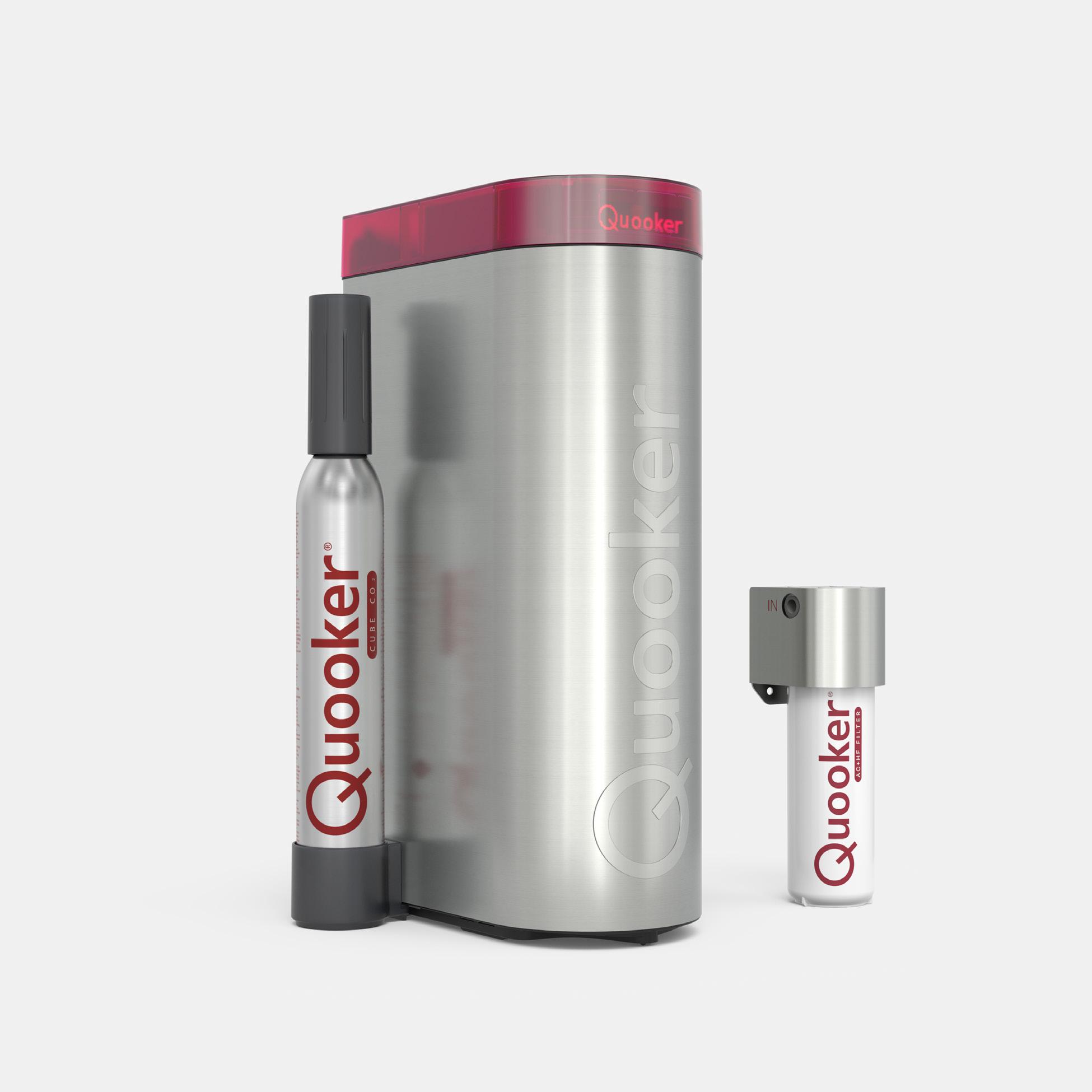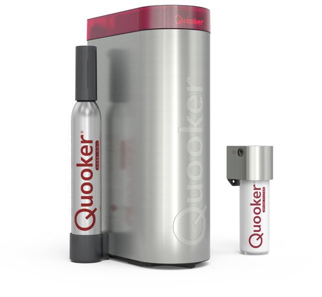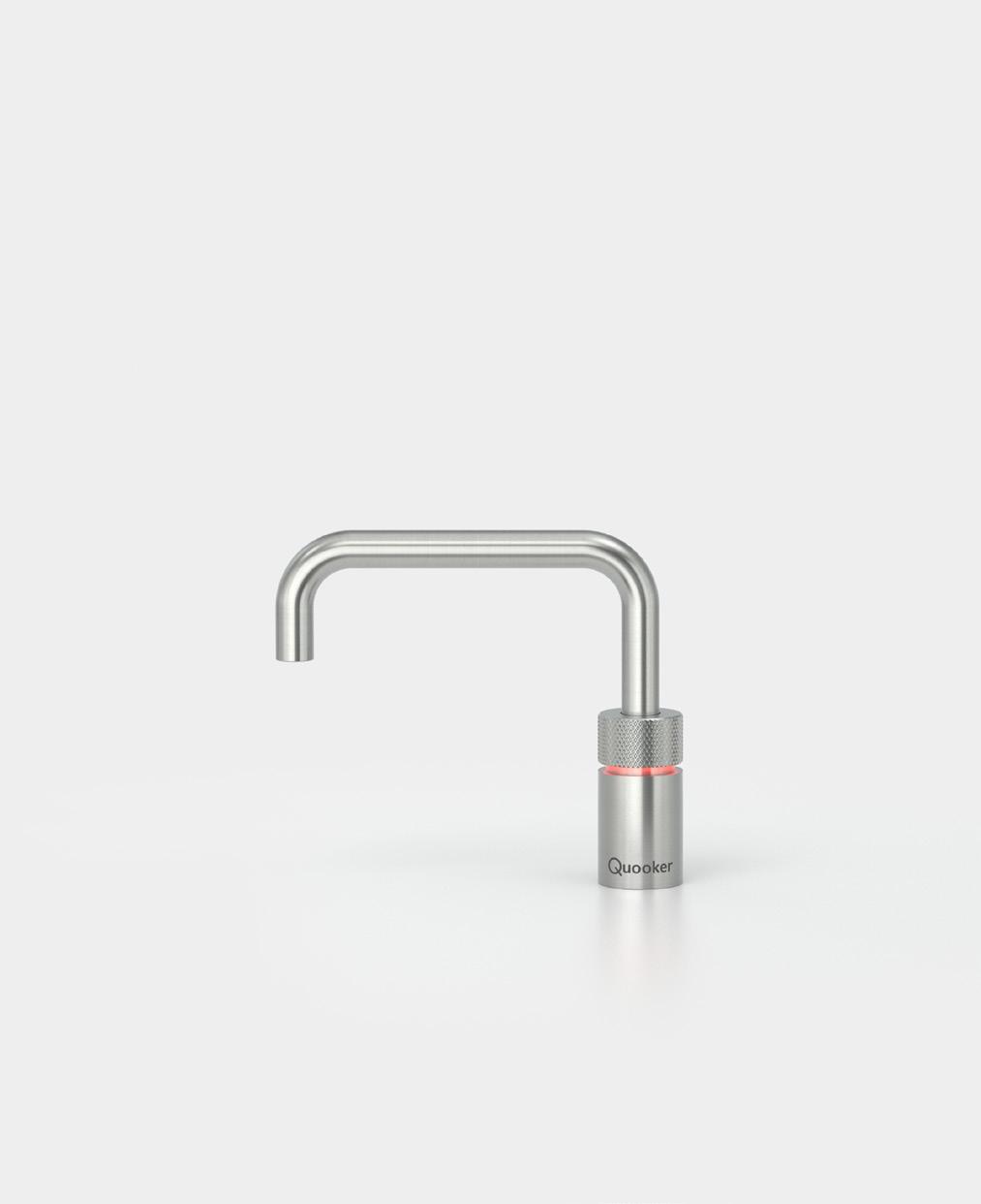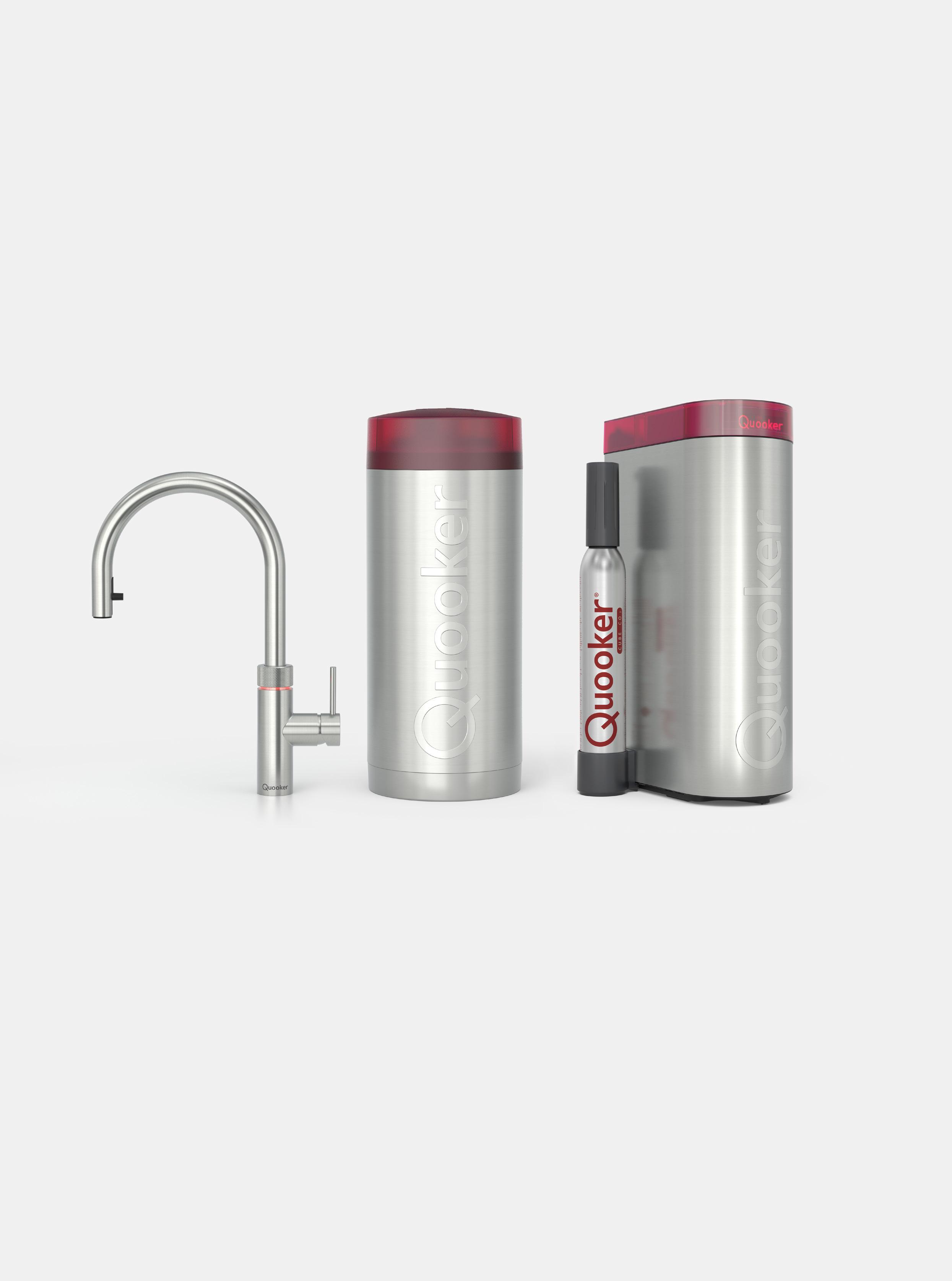 Quooker 系統由一套水龍頭及連接 到廚櫃中的水箱構成。Quooker 的水 箱就像一個連接到水喉的真空瓶,水 箱中的水會被加熱至 108 °C 高溫。 當你打開水龍頭時,水會在水龍頭流 出時稍微冷卻,但依然維持在沸點 (100 °C),而新鮮的水會馬上流入水 箱,並由水箱內的 HiTAC® 特別活性 碳過濾器進一步過濾潔淨。除了熱水 箱以外,Quooker 更推出了可提供已