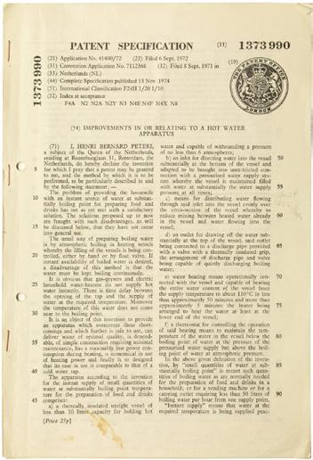 當時的 Henri Peteri 正在為一間國際食品公司開發新款的即 沖湯包,他意識到,如果身旁沒有滾水,即冲湯包 就不可能成為真正的即食湯。從那時起,他就一直執著於實 現這個想法,並開始在家裡的地下室中不斷努力,希望能夠 研發出一種可以即時產生滾水的設備。