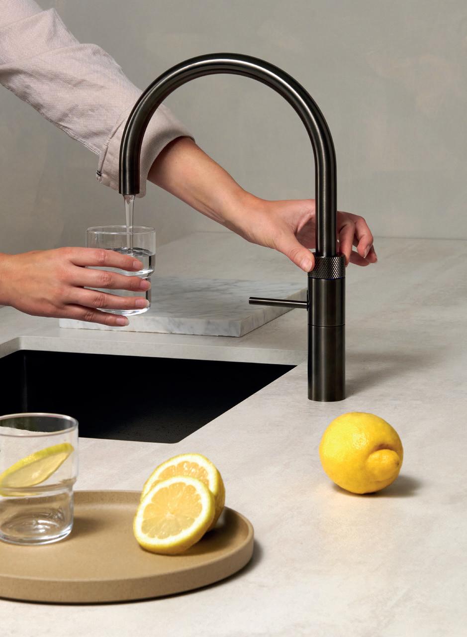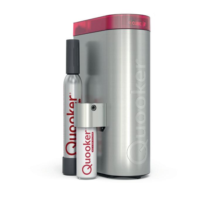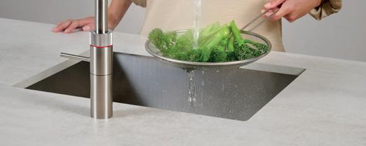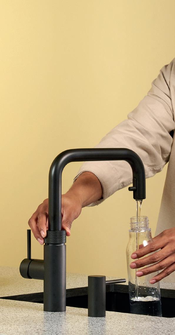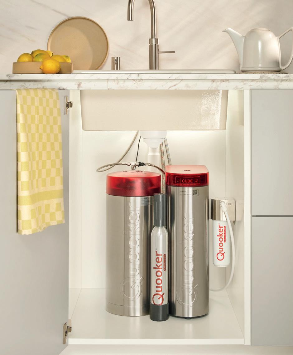 Gefiltertes stilles Wasser oder gefiltertes, gekühltes stilles und sprudelndes Wasser Mit dem Wasserfilter zapfen Sie gefiltertes stilles Wasser aus Ihrem Quooker-Hahn. Wenn Sie sich für den CUBE entscheiden, zapfen Sie gefiltertes gekühltes stilles und sprudelndes Wasser. Den Wasserfilter oder den CUBE platzieren Sie im Küchenschrank neben dem Quooker-Reservoir. Das Filtersystem ist mit einem Hohlfaserfilter und einem Aktivkohlefilter ausgestattet, die mikrobiologisch filtern und außerdem Chlor sowie Verunreinigungen aus dem Wasser entfernen. Der CUBE ist außerdem mit einem CO₂-Zylinder angeschlossen, mit dem Ihr Quooker-Hahn bis zu 60 Liter sprudelndes Wasser liefert.