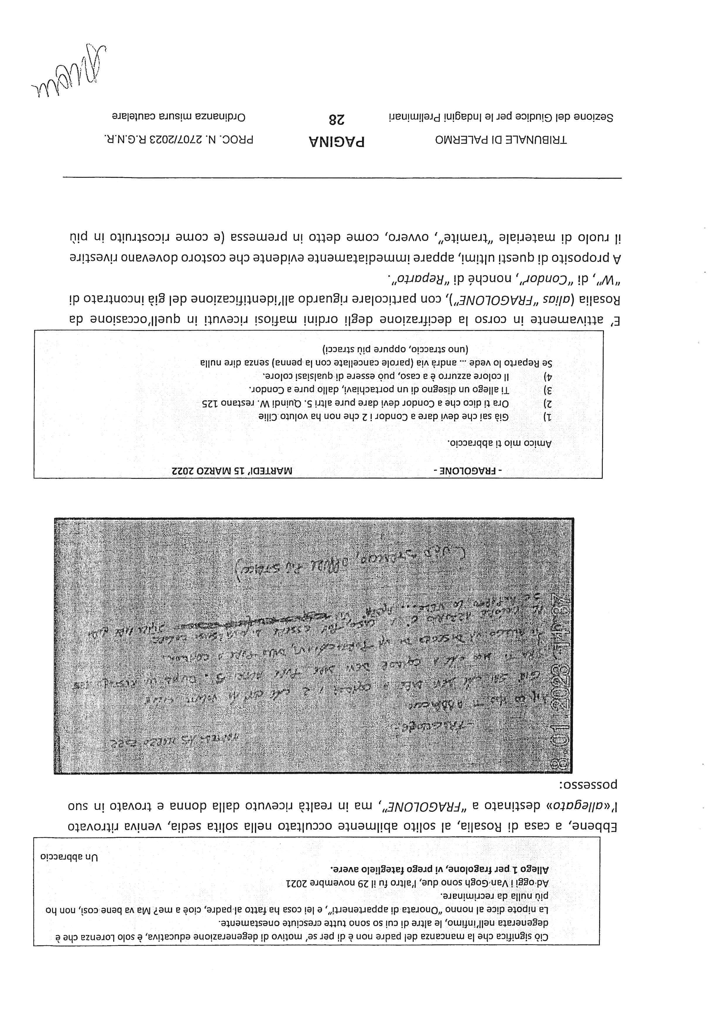 A ciò si aggiungano alcune annotazioni di carattere personale che Messina Denaro Rosalia sintetizza nella trascrizione che fa della missiva ("scatola orol. dare solo i 2 non li toccare più") prima, verosimilmente, di distruggere l'originale conformemente al volere del fratello e che trova, poi, corrispondenza in un'altra missiva ancora indirizzata a "Fragolone" in data 15 marzo 2022 ("Già sai che devi dare a Condor i 2 che non ha voluto Cilie").