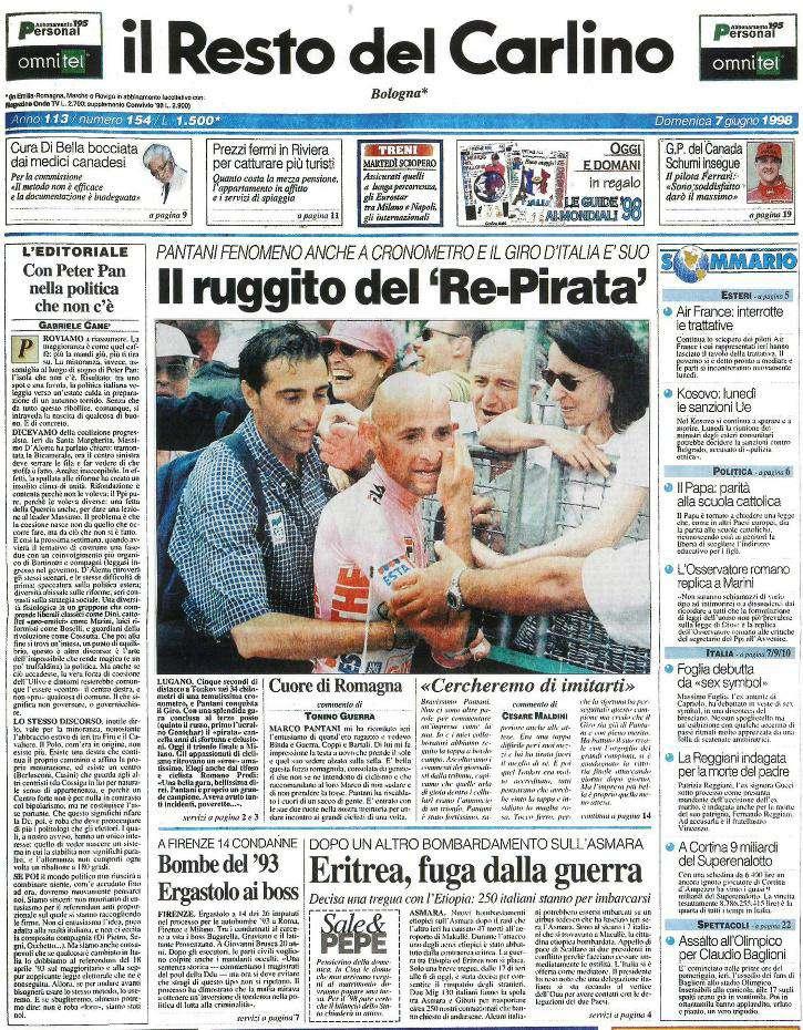 Quando ilPiratasialzavasuipedali,sulle leggendariesalitedelMortirolo,del Galibierodell’Alped’Huez,tuttal’Italiasi fermavaetrattenevailrespiro.Sapevano, itifosidiMarcoPantani,cheavrebbero assistitoaun’altraimpresaepica,diquelle chesiraccontanoaifiglieainipoti. Epuntualmentesuccedevailmiracolo: Pantaniscattavaeriscattavaeilrivaledel momento,fosseRiis,TonkovoUllrich, allafinecedeva.Edopol’immagineera semprelastessa:ilPirata,semprepiùsolo, chespingevasuipedaliinmezzoadueali difollafestanti.Quantipomeriggi dilacrimeegioiapernoiitalianiche perunavolta,graziealnostroPantanì, davamolezionidiciclismoaifrancesi. Il1998ful’annod’orodelragazzodi Cesenatico,capacedirialzarsidopomille caduteeinfortuni.Marcovinseprimail Giro,poitrionfòalTourstaccandodinove minutilamagliagiallaUllrichnella leggendariatappadelColduGalibier, un’impresacherimarràpersemprenegli annalidelciclismo.Nessunitalianoerapiù riuscitoafareladoppiettadaitempidi FaustoCoppi.MarcotornòinItaliaaccolto comeunastaresembravachenulla potessepiùfermarlo.Invece,l’annodopo, ilmondocrollò.Fermatoperl’ematocrito altoallafinediunGirogiàincassaforte, Pantanifusqualificatoenonsiripresepiù: nonaccettavaquelmarchiodeldoping cosìingiusto.Eloera,ingiusto.Perché recentiinchiestehannosvelatochedietro atuttoc’eranolacamorraeungirodi scommesseclandestine.IlPiratafinìinun tunneldidrogaedepressione.Morìsolo, inunresidencediRimininel2004.Lui chetantagioiaavevaregalatoall’Italia.