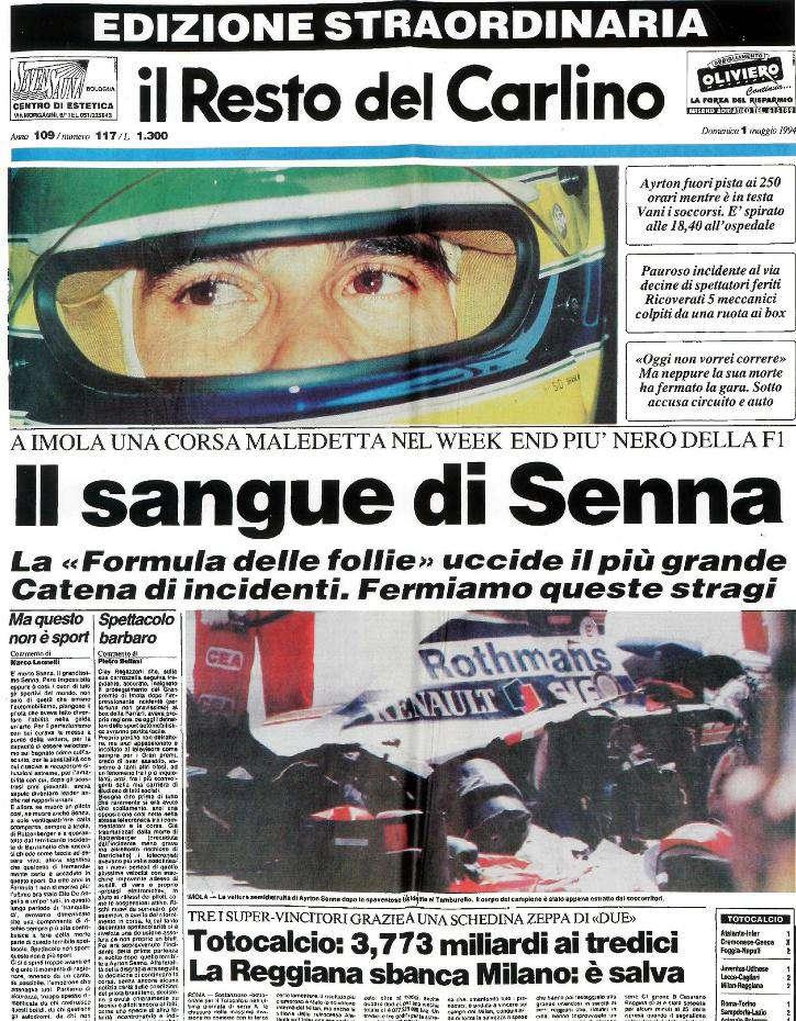 Sono passatiquasitrentunoanni,ma nessunocheabbiaassistitoindiretta, dalletribuneointv,all’incidenteche costòlavitaadAyrtonSennadomenica1° maggio1994nell’AutodromodiImola potràmaicancellarequeimomenti.La WilliamsRenaultchevadrittaallacurva delTamburello,loschiantoconilmurodi cemento,latestadeltrentaquattrenne campionebrasilianochesimuoveinmodo impercettibilealimentandounanelitodi speranzainmilioniditifosieappassionati inognianglodelglobo.Epoiancora l’elicotteroinpista,lacorsadisperata all’ospedaleMaggiorediBolognae,poco primadellsettedisera,lanotiziapiù tremenda:Sennaeramorto. Lascomparsadeltalentobrasilianosegnò unprimaeundoponelmondodella Formula1elasuamortefu,inuncerto modo,laperditadell’innocenzaper un’interagenerazione.Nonc’eranopiù eroiinvincibiliingradodicorrereai300 all’oraeusciresaniesalvidaogni incidente.Adimostrarlo,anchelatragica morte,appena24oreprima,semprea Imoladuranteleprovedisabato30aprile, dell’austriacoRolandRatzenberger(24 anniappena):lasuamonopostodecollò letteralmentedopoesseresalitasuun cordolosenzalasciargliscampo.La commozioneel’emozionediquel weekendmaledetto,elasuaeccezionalità, portaronoil Carlino arealizzare un’edizionestraordinariaproprio domenica1°maggio:perildoveredi raccontareailettoriquantoeraaccadutoa Senna,eanchecomeomaggioaunodei piùgrandicampionidellosport contemporaneo.