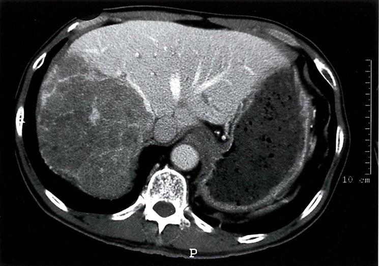 Figura 96 Carcinoma hepatocelular TC abdominal con contraste (vista axial) Se puede ver una masa hepática hipodensa sin una demarcación clara con el tejido hepático sano.
