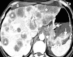 ♦ La invasión vascular del tumor puede ser visible (p. Ej., Trombosis de la vena porta )