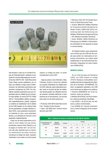 rance of Solid Recovered Fuels. • Austria: BMLFUW (2008a) Richtlinie für Ersatzbrennstoffe [Guideline for Waste Fuels] y BMLFUW (2010) Verordnung über die Verbrennung von Abfällen Abfallverbrennungsverordnung – AVV [Waste Incineration Directive]. • Suiza: BUWAL (2005) Richtlinie zur Entsorgung von Abfällen in Zementwerken [Guideline for the disposal of waste in cement plants]. En España existen unas características mínimas que los CSR han de cumplir para poder ser valorizados en empresas cementeras, las cuales están establecidas en las Autorizaciones Ambientales Integradas de cada instalación (CEMA 2016). MARCO LEGAL