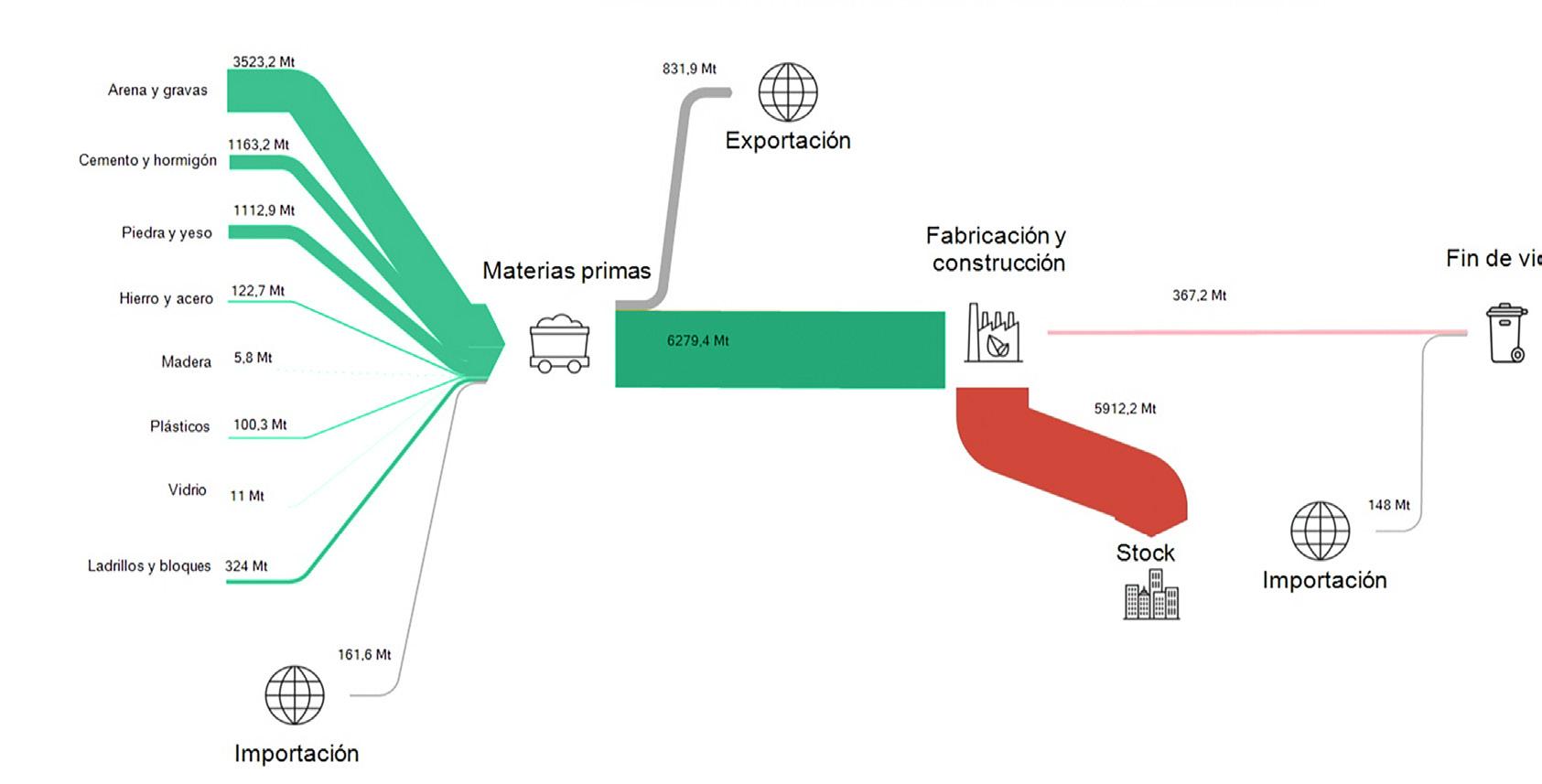 trabajadores, los datos indican que, por ejemplo, aunque los residuos de construcción y demolición (RCD) han alcanzado tasas de valorización del 84%, solo el 11% del árido consumido proviene de reciclaje. Esto refleja la necesidad de mejorar tanto los procesos de separación en obra como el marco normativo para garantizar la utilización efectiva de materiales reciclados.