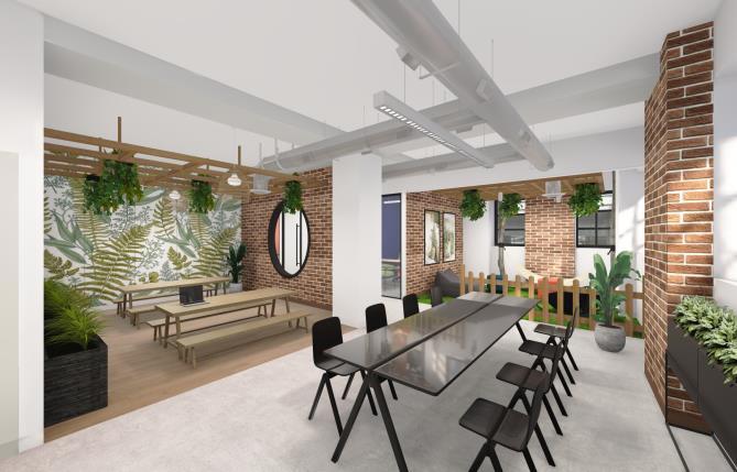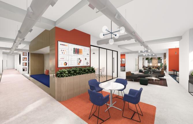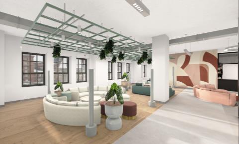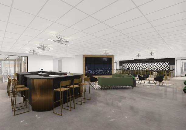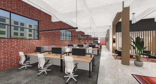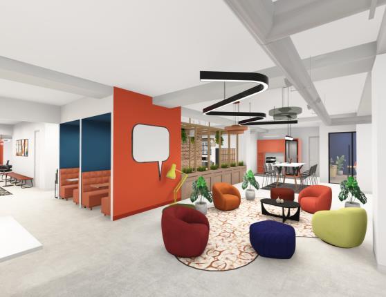The interactive walkthrough highlights a vibrant office floor with dynamic interiors, cozy lounges, and a spacious kitchen designed to foster collaboration and comfort, offering a realistic preview for clients and stakeholders.
