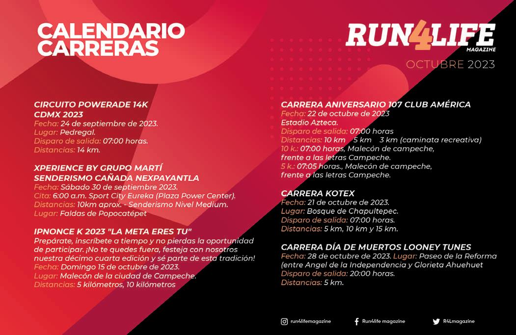 RUN4LIFE MAGAZINE no se responsabiliza por información y las fotografías proporcionadas por los anunciantes. Dicha información se asume como confiable de acuerdo a las fuentes de donde se obtiene. Queda prohibida la reproducción total o parcial del contenido. Distribuidor por Comercializadora GBN, S.A DE C.V con domicilio en Federico Dávalos 35 Col. San Juan Tlihuaca C.P. 02400, Azcapotzalco, CDMX, México.