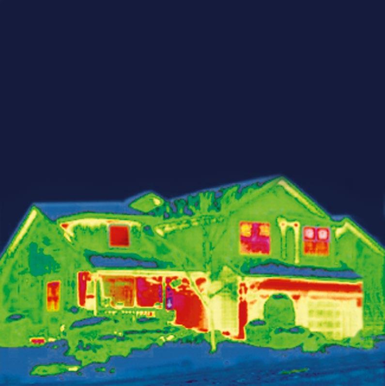 De overdracht van warmte door de ramen van binnen naar buiten is weergegeven in dit infraroodbeeld. De rode delen geven de hoogste graad van warmteverlies weer.