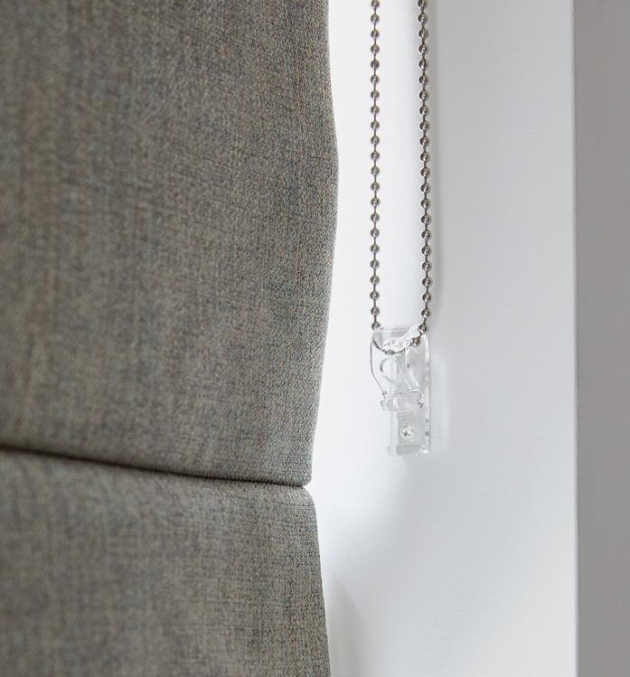 De kettingbeveiliging werkt eenvoudig en voldoet aan de EN-kind veiligheidsvoorschriften. Indien je te veel kracht uitoefent bij de bediening van de ketting wordt de kettingbeveiliging geactiveerd en komt de ketting los. Het kettingelement kan eenvoudig weer teruggeplaatst en vastgeklikt worden. De kunststof ketting is beschikbaar in wit en lichtgrijs.