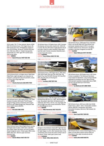 290 Airframe Hours, 290 TIS Engine Hours, RV6 TT AF/ENG/Prop 290 Hrs LYC. 0 360 180 HP Metal FP prop. Nil accident. Best SAAA ‘All Metal Aircraft’ in 2006 CRZ 160 KTAS on 30 ltrs. CoA, Day/Night VFR with NO flight over built up area restrictions. $100K. E: rv6mjh@bigpond.net.au PRICE $95000 CONTACT Mike Horneman 0417 931 872