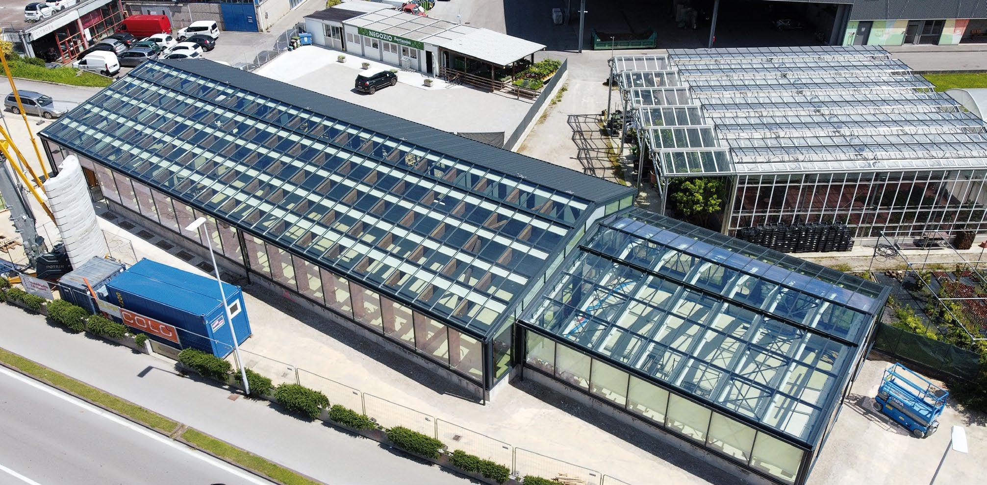 with photovoltaics. The panels Rabensteiner integrated into the fixed roof surfaces not only improve the climate within the garden center, they can also easily be retrofitted with photovoltaic modules. This means the garden center can utilize sustainable energy sources in the future without the need for major renovations.