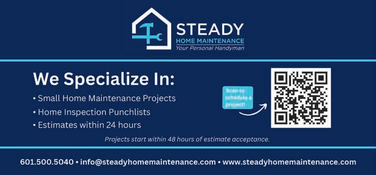 Central Mississippi Real Producers • 7 6 • September 2023 @realproducers realproducersmag.com Cleaning Services · Janitorial Services · Moving Services (601) 291-7936 fosterscleaningandmoving.com Celisa and her team will do an amazing job and can be counted on! -Anna S. ONE COMPANY. Packing Loading Unloading Cleaning Where Every Project Is Different & Every Client Is Special. SPECIFICALLY DESIGNED FOR YOU Beautiful Spaces, MS LICENSE #15006301 • Security • Cameras • Home Automation And More! SINCE 1987 www.penningtonandtrim.com Celebrating 36 Years! GOT A LEAK? You Can Trust Us! • Tankless & Traditional Water Heaters • Sewer Replacement & Repair • Water Leaks • Commercial & Residential Plumbing Repair (601) 421-6215 • anglinplumbing.com Dylan Anglin, Owner (601) 953-4897 | Jackson, Mississippi Inspections You Can Trust! Prompt and Reliable Buyer Inspections | Seller’s Inspections Investment Property Inspections Serving Central Mississippi mississippisbesthomeinspections.com Dave Riegel, Owner Now Offering PAY AT CLOSE!