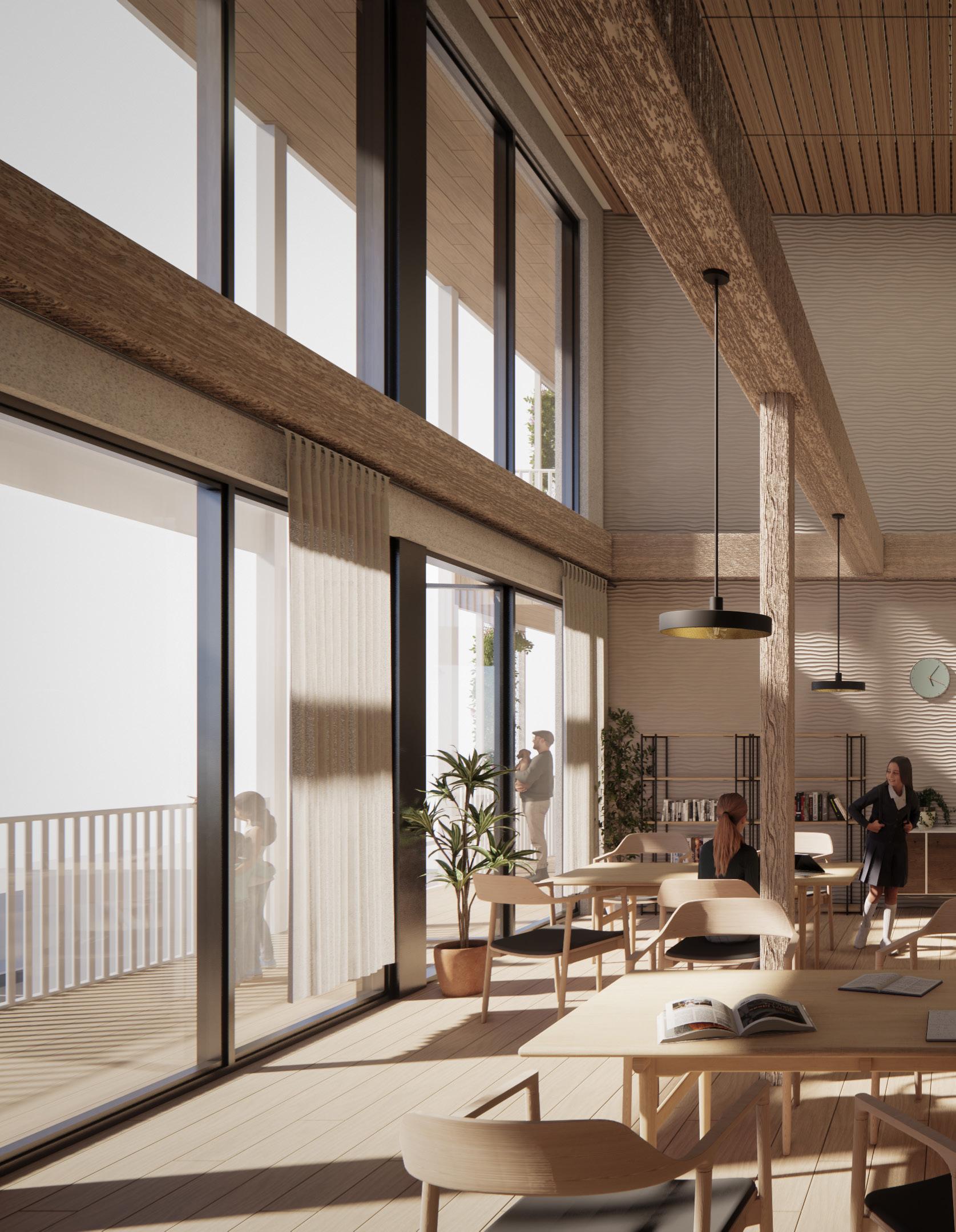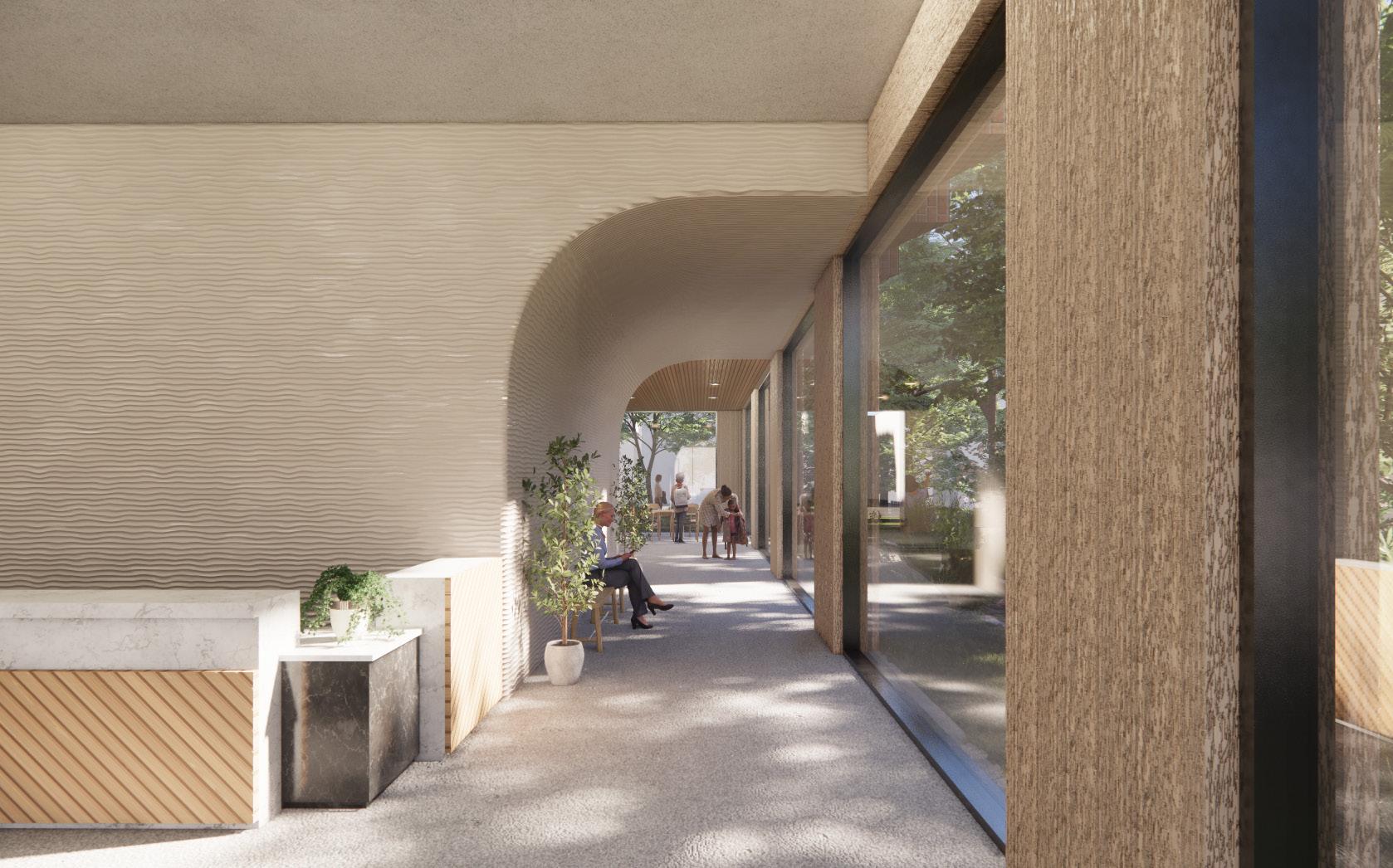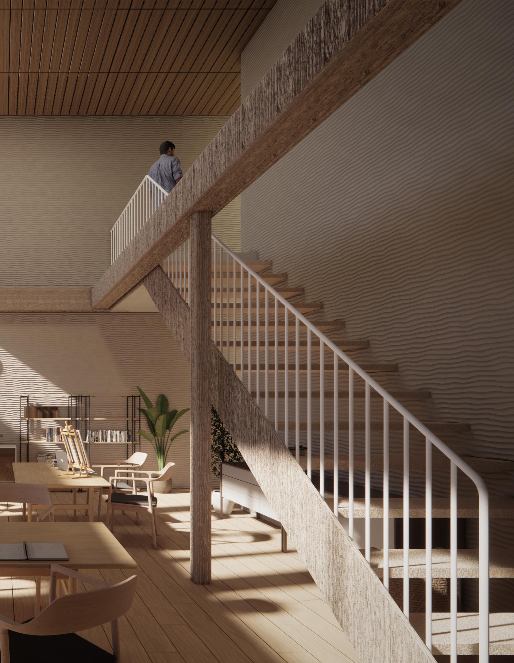 The curved wall in the hallway can be seen as a symbolic gateway, marking the transition from one area to another. It acts as a visual cue, signaling the change in atmosphere or purpose as one moves from one part of the building to another. This design element can evoke a sense of intrigue and curiosity, inviting people to explore what lies beyond the threshold. Beyond that is a shared space for the community.