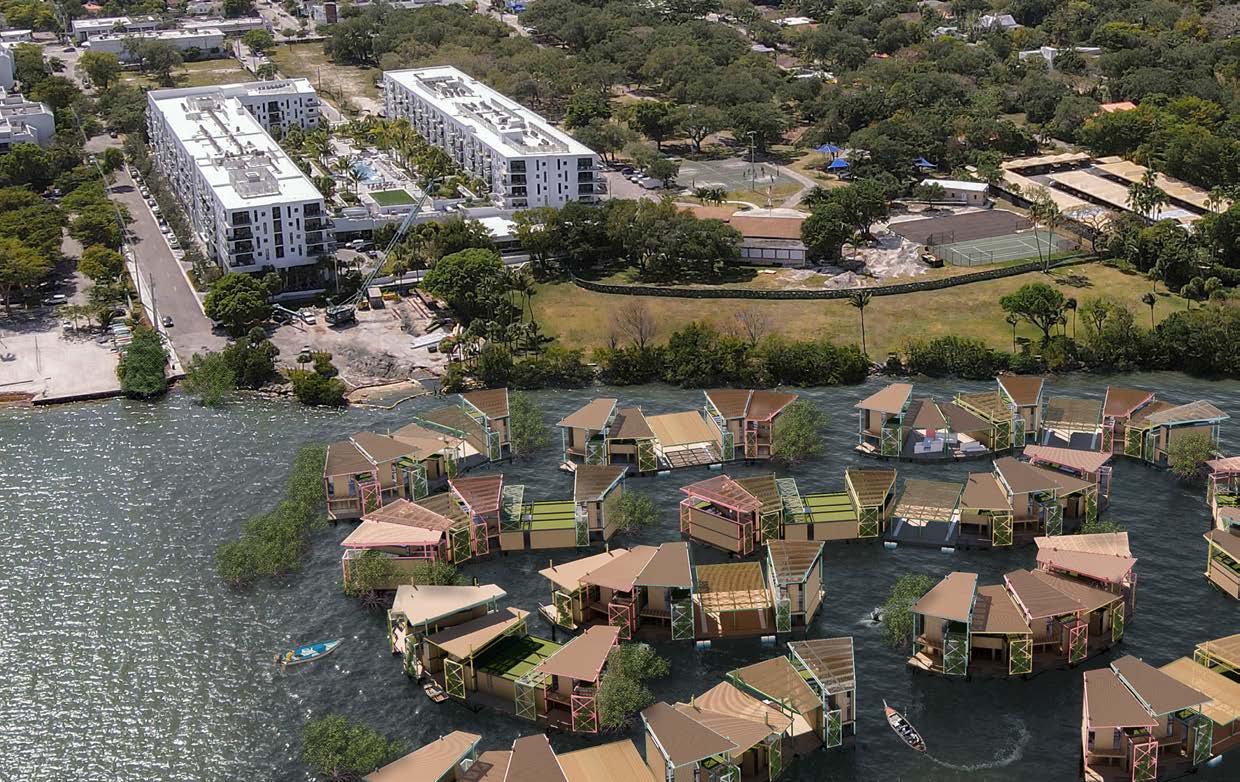 While these residents re-establish their communities on the water level, the canopy above and the steel structure below rebuild the wounded habitat of the ospreys and hundreds of fish species native to Biscayne Bay - the rusted system of the steel becomes a perfect surface for coral reef growth to help rebuild a vibrant ecosystem underwater. Similarly, the canopy above acts like a protective tree canopy, fostering ecosystems for birds, insects and native plants, even in harsh weather. With storm shutters and the gliding connections of the floating platforms to the steel columns, the modules’ resiliency can withstand hurricanes and rising water levels, creating a truly sustainable community.